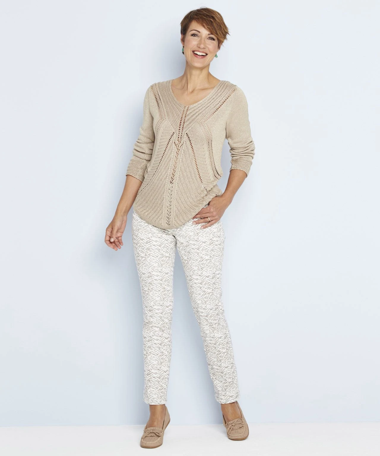 Cleanly fitted ladies trousers in stretch cotton and a modern animal print .