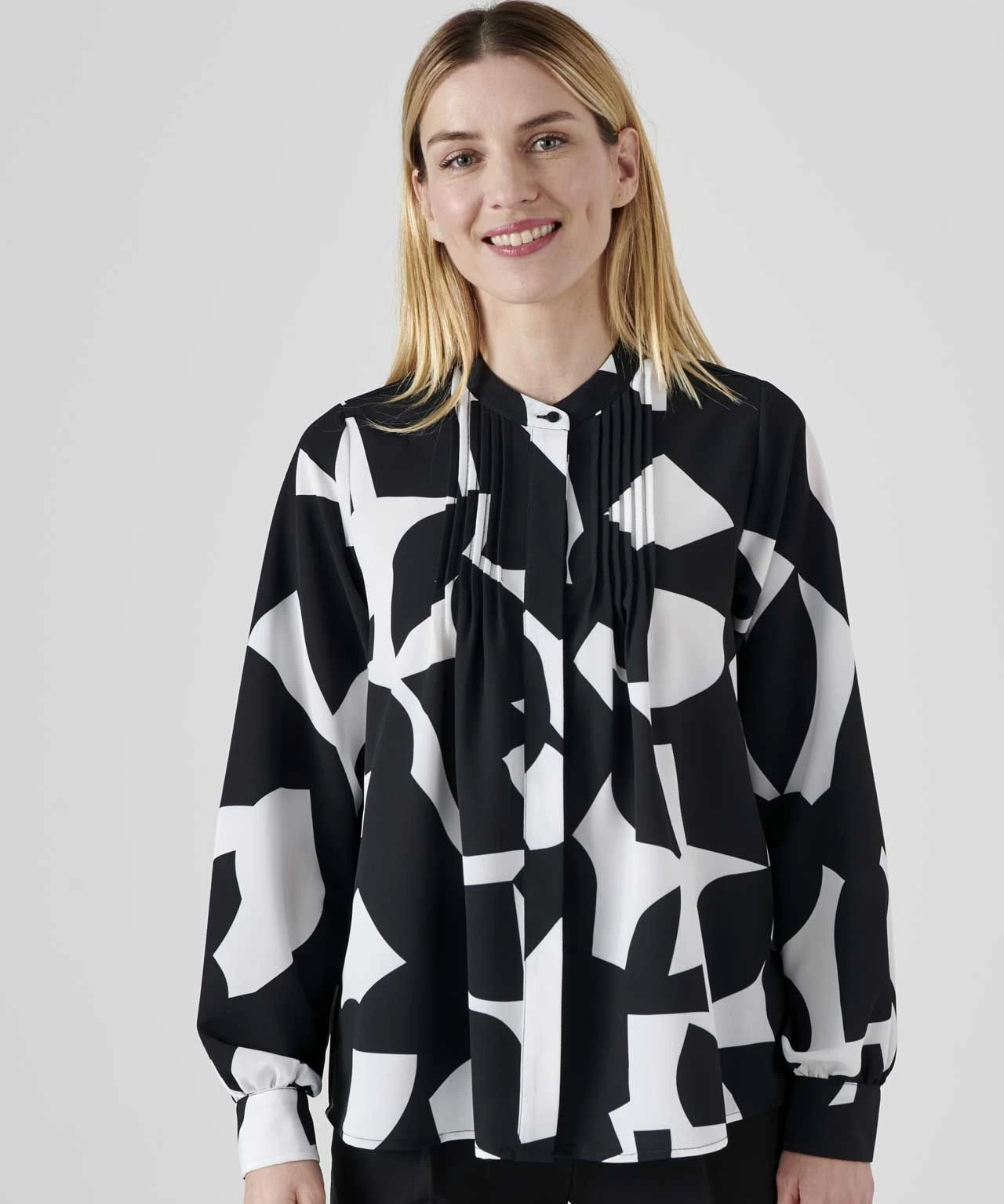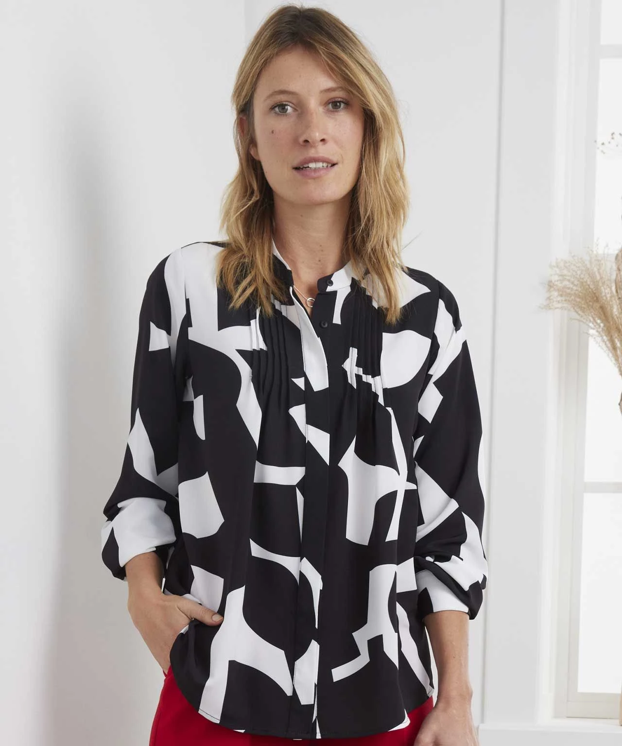 Make a statement with our graphic print collarless blouse in a bold monochrome design.