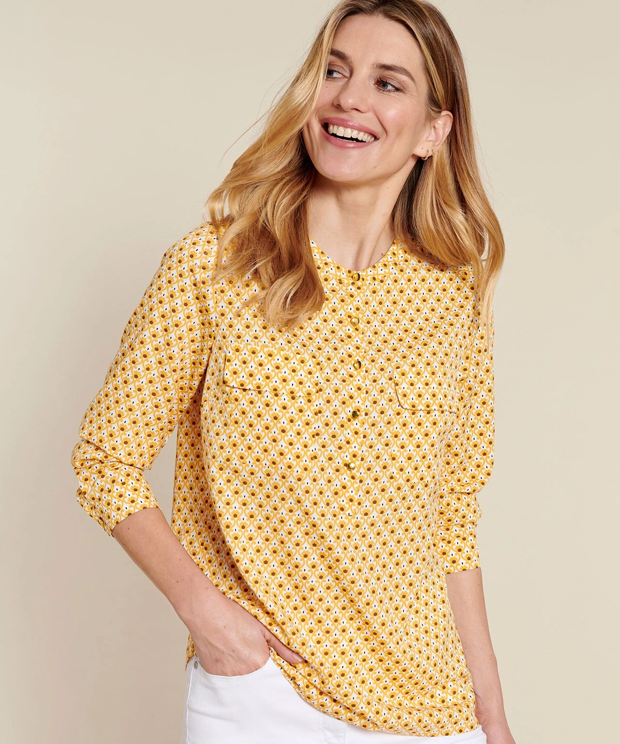 What could be easier or more flattening than this tunic style ladies blouse? With a half-button placket and flap pockets, a round neckline gives it a casual look, so you can team it with jeans for an easy off-duty look. In a fresh geometric print that comes in a range of colours to complete your wardrobe. Woven. Regular fit.