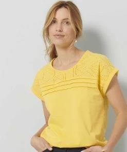 Dressier than your average T-shirt, this top has embroidery detail on the front, rows of pleats and turn back cuffs. Pure cotton means that even when the temperature rises, you’ll still feel fresh. In three great colours, it’s a great way to brighten up your wardrobe. 100% Cotton. Length: 64cm (25″) approx.