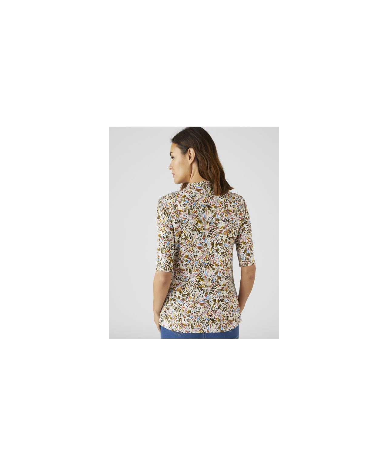 A modern take on a T-shirt with gathering at the neck for an updated look. In a fresh print with short sleeves, made from a soft stretch fabric for comfort. Looks great with tailoring or teamed with jeans. Eco-friendly fabric. Knitted. Regular fit. Machine washable. 95% Viscose, 5% Elastane. Length: 61cm (24″) approx.