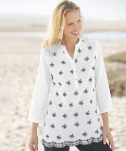 What more could you want on a warm day than a cool and stylish tunic blouse? Finished with embroidery detail and pretty scalloped hemline. A great partner with jeans or shorts, with a Tunisian collar and three quarter sleeves. Regular fit.