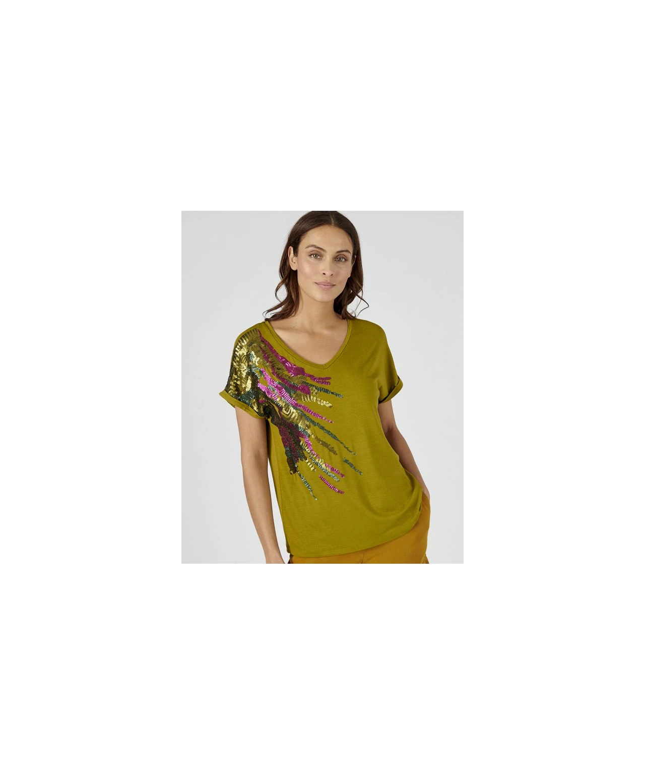 The perfect evening T-shirt when you want comfort and sparkle in one easy piece. A contemporary V neck shape in a flattering colour, finished with an asymmetric splash of colourful sequins. Made from our sustainable fabric with stretch so it feels good and is kind to the planet. With sequin detail. Regular fit. 95% Viscose, 5% Elastane. Length: 61cm (24″) approx.