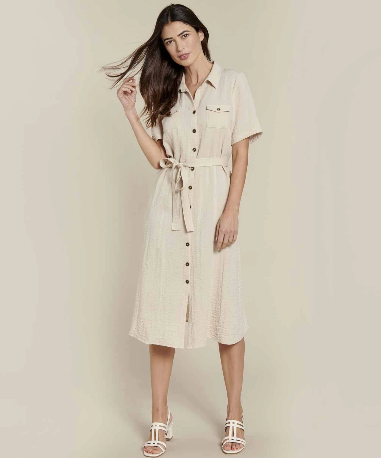 Summer’s favourite shirt dress in easy care crinkle for fabulous comfort.