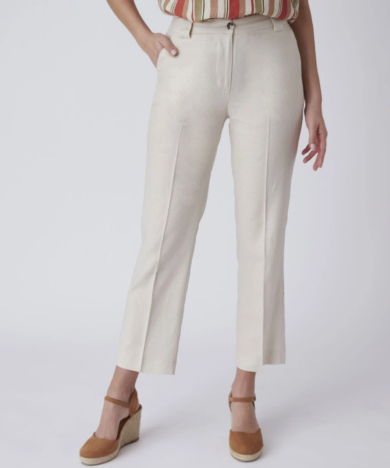 Our cool linen rich fabric makes these the ideal trousers for spring and summer. With zip and button fastening, back stretch at the waist for comfort and side pockets. In a cropped length, perfect for your warm weather wardrobe. Natural fibres. 55% Linen, 45% Viscose. Length: 64cm (25″).