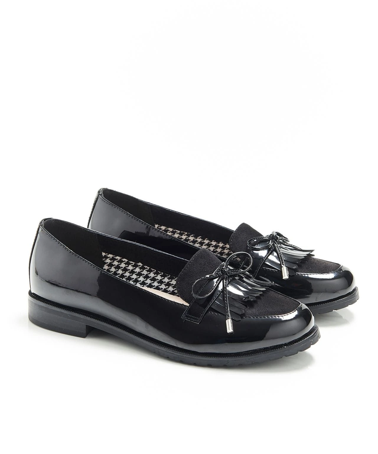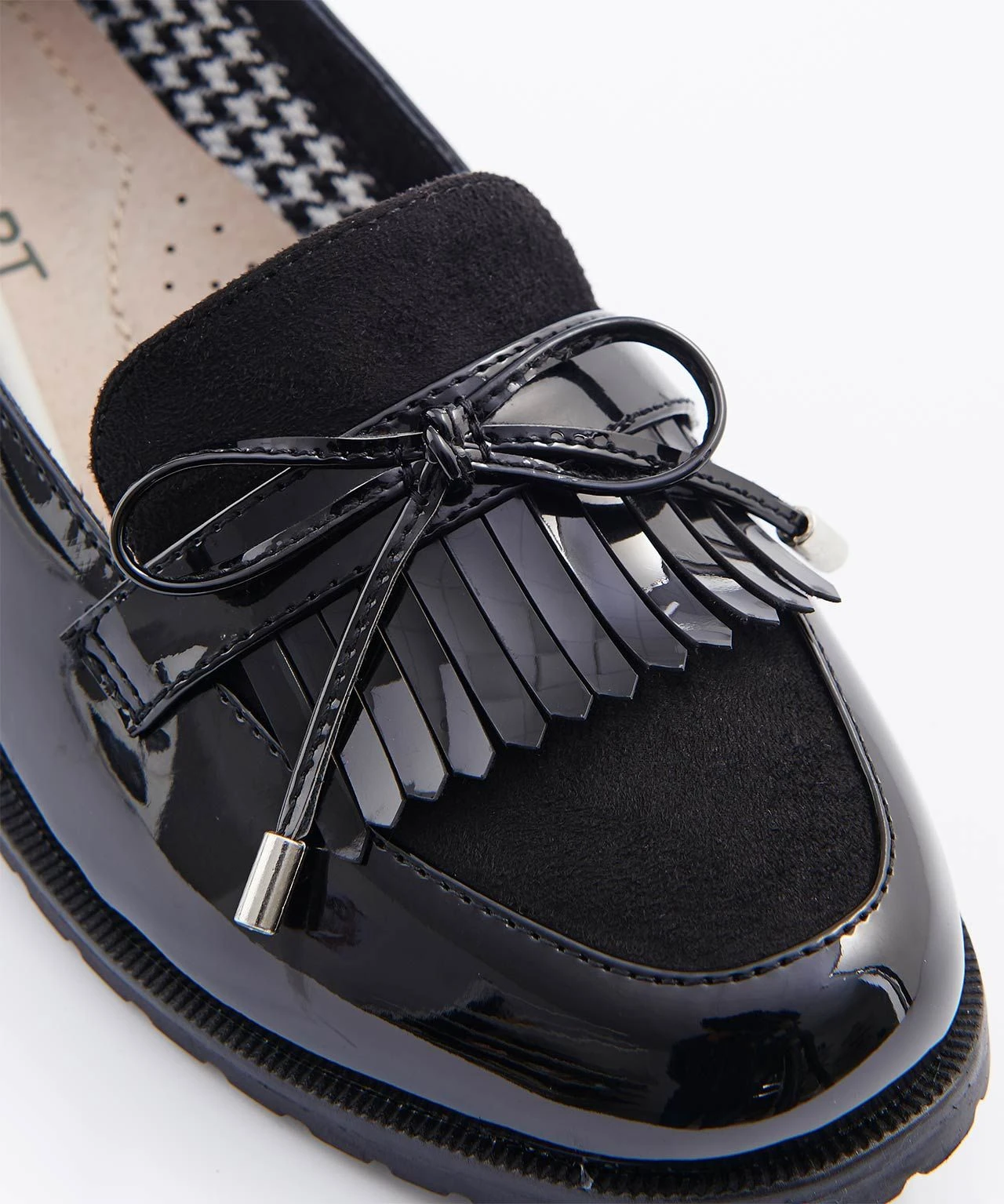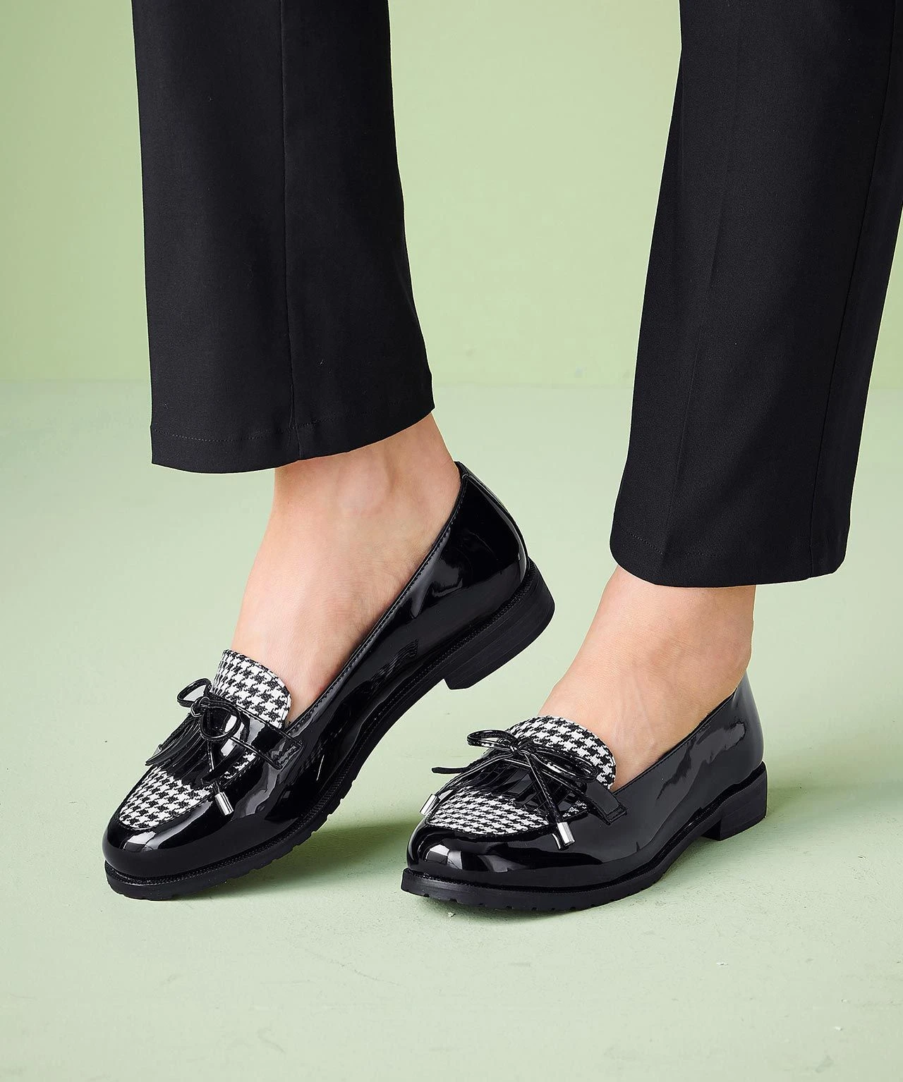 Striking two-tone moccasin shoes in a retro inspired design. Contrasting patent with dogtooth fabric for a distinctive look, you can team them with smart separates or your favourite jeans. Finished with foot support so they feel as good as they look. Heel height: approx. 2cm. Upper/Sole: Other materials. Lining: Textile. Sock: Leather. E width