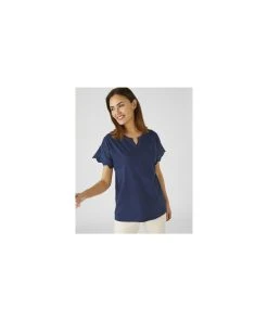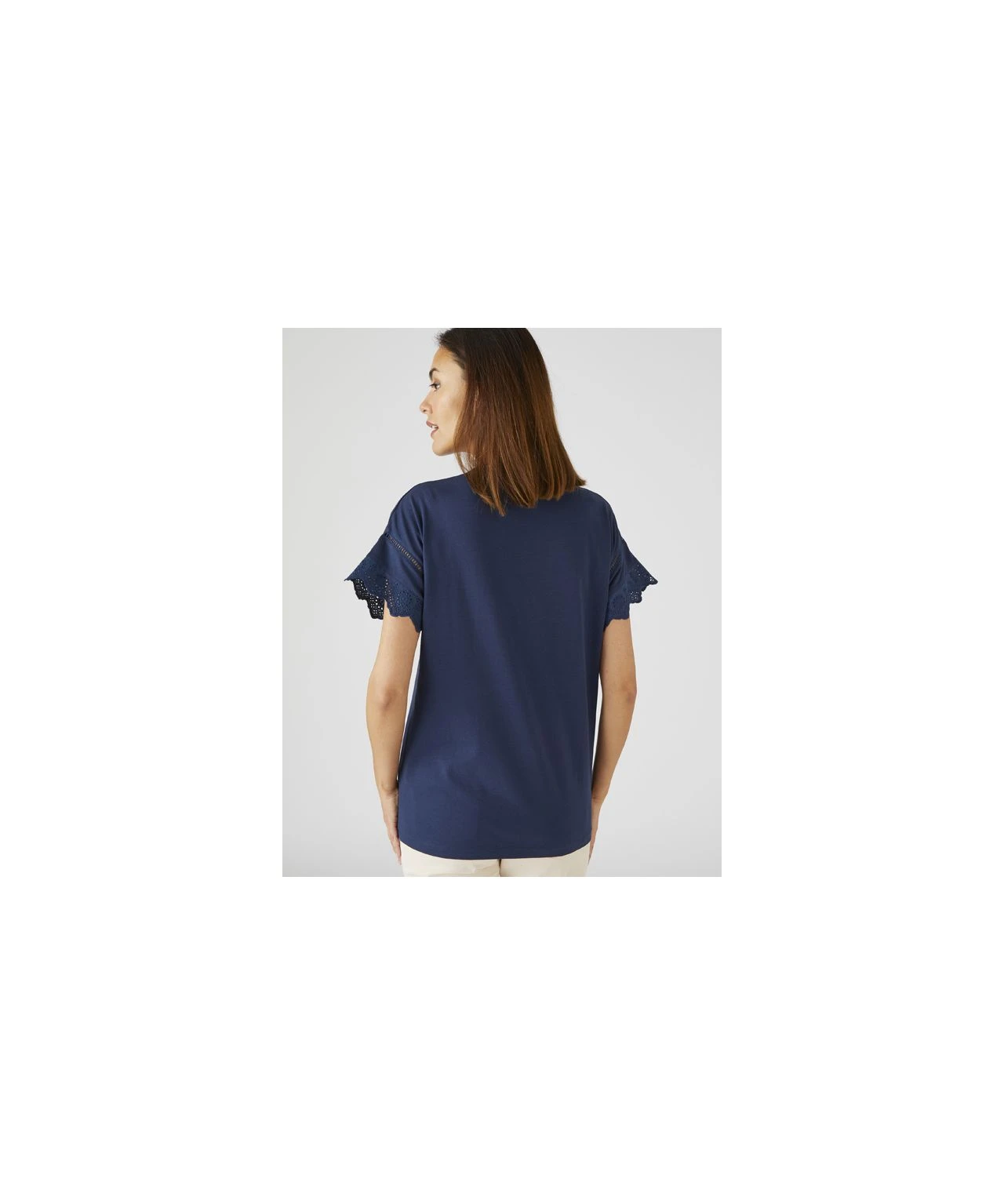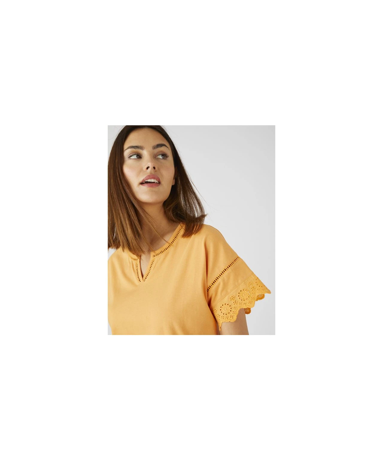 If you’re looking for a T-shirt that’s prettier than most, you’ve found it. Our Organic cotton tee has a Tunisian style collar and broderie anglais trim sleeves with a scalloped edge. Ladder work around the neck and sleeves completes the look. In a wide range of colours. Knitted. Regular fit. Machine washable. 100% Cotton. Length: 64cm (25″) approx.