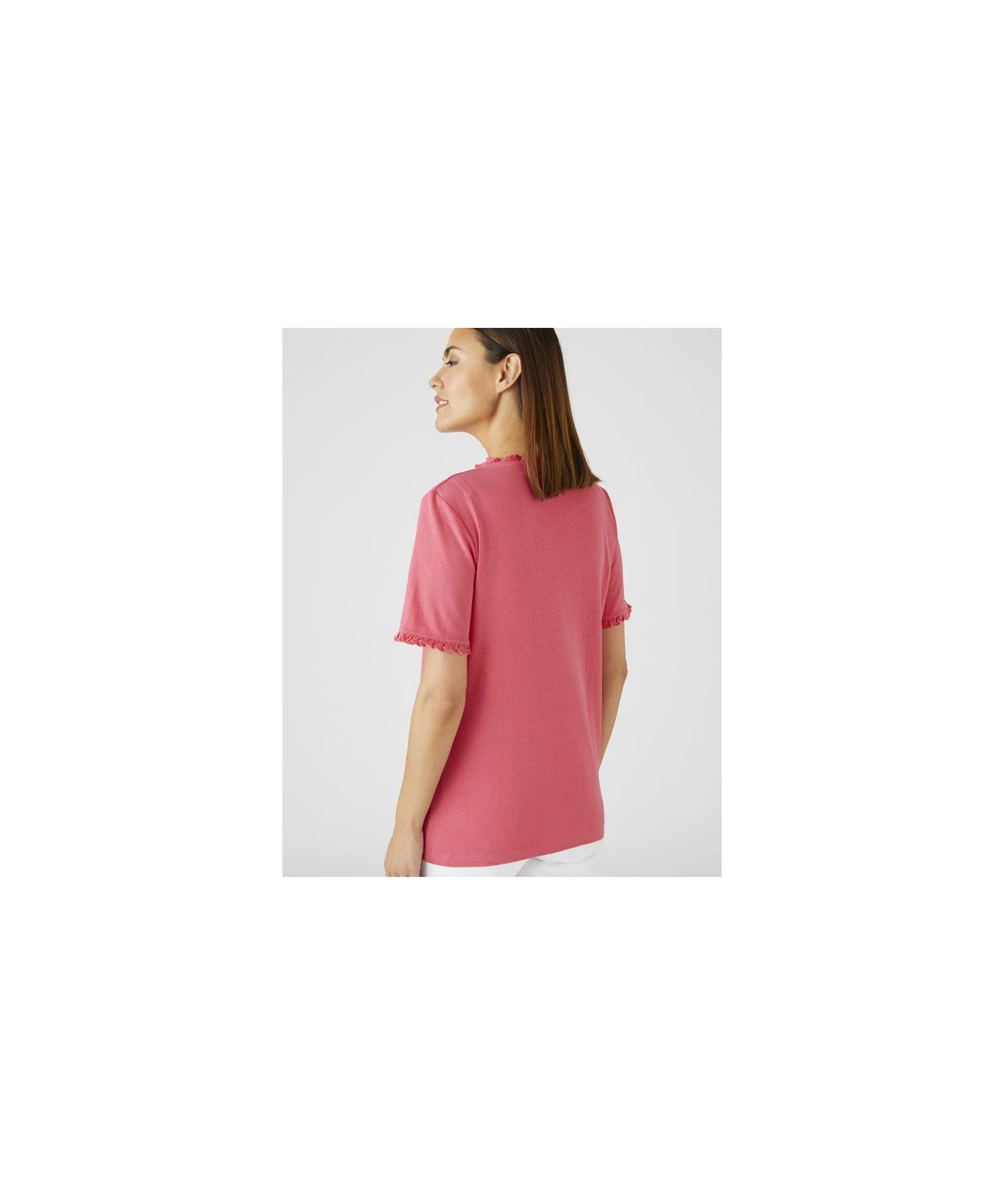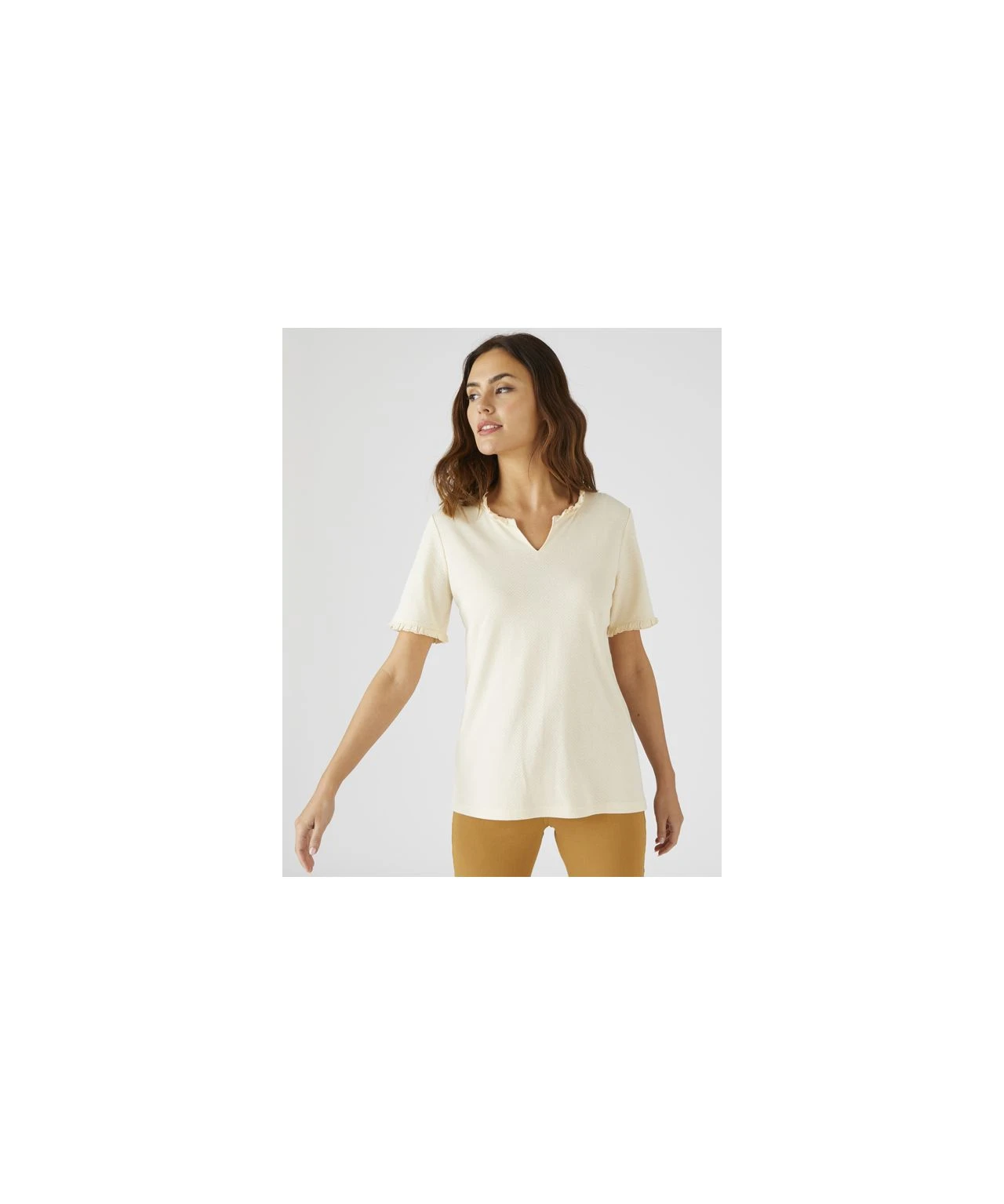 You’ll feel great when you wear this pure cotton T-shirt – the frill trims add a really pretty look.