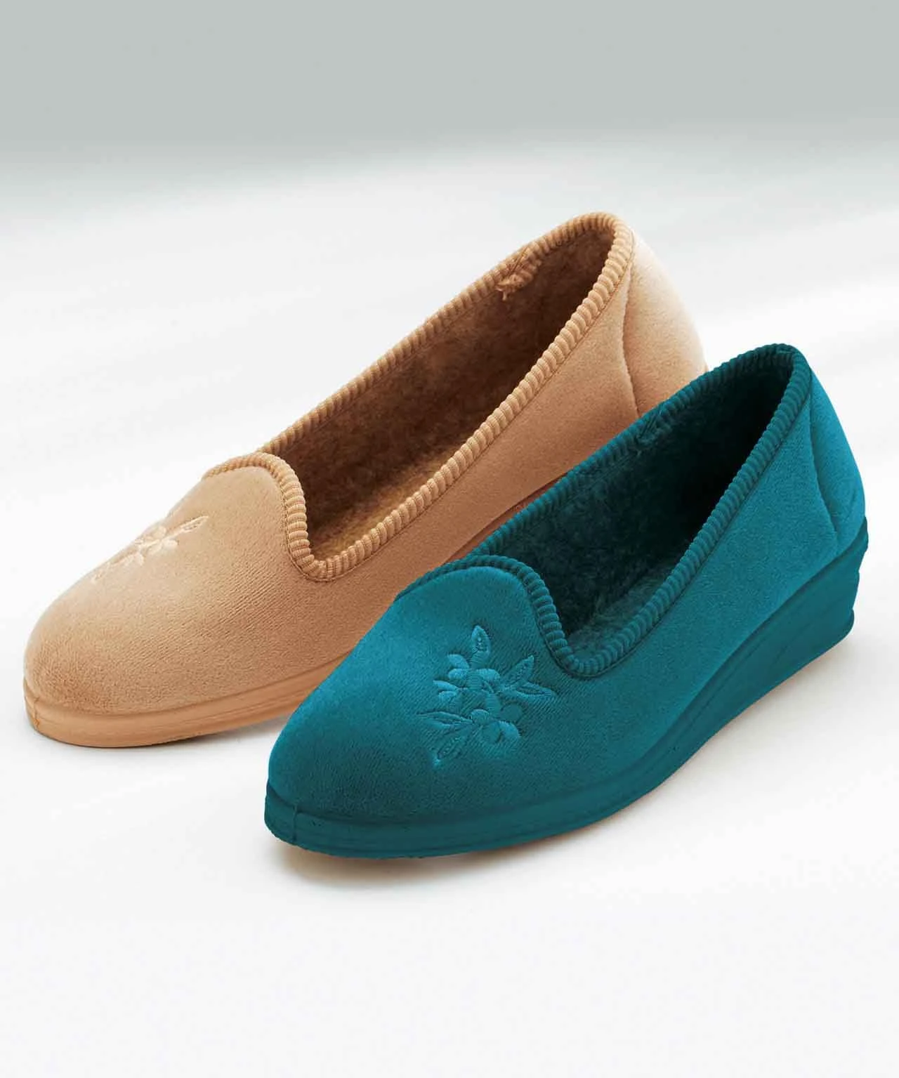 Stock up for the season ahead with our two pack of slippers. A timeless slippers, great around the house. A great value option with embroidery detail for added style. Heel height: approx. 2cm. Upper/Lining: Textile. Sole: Other materials Width: E Fit