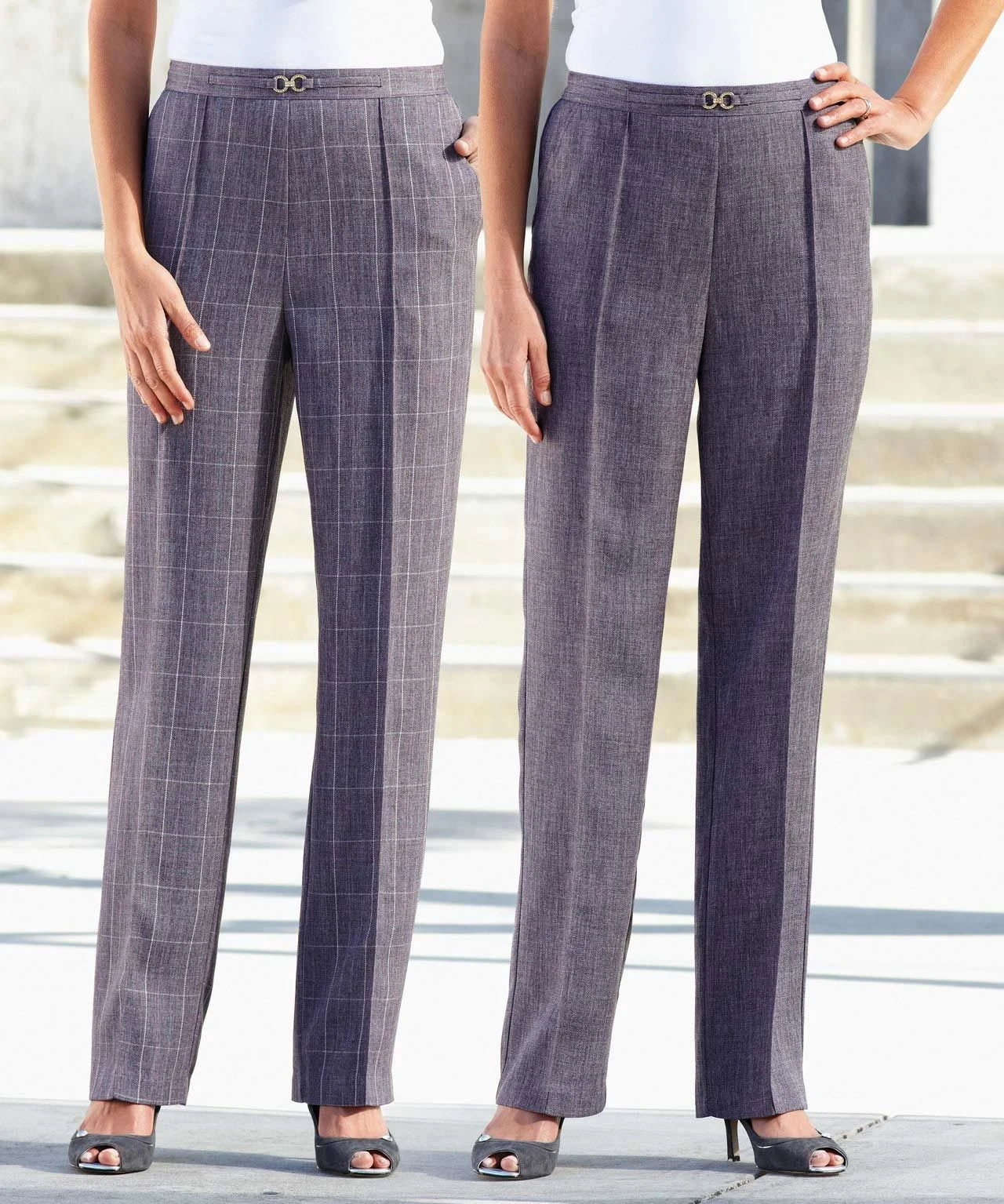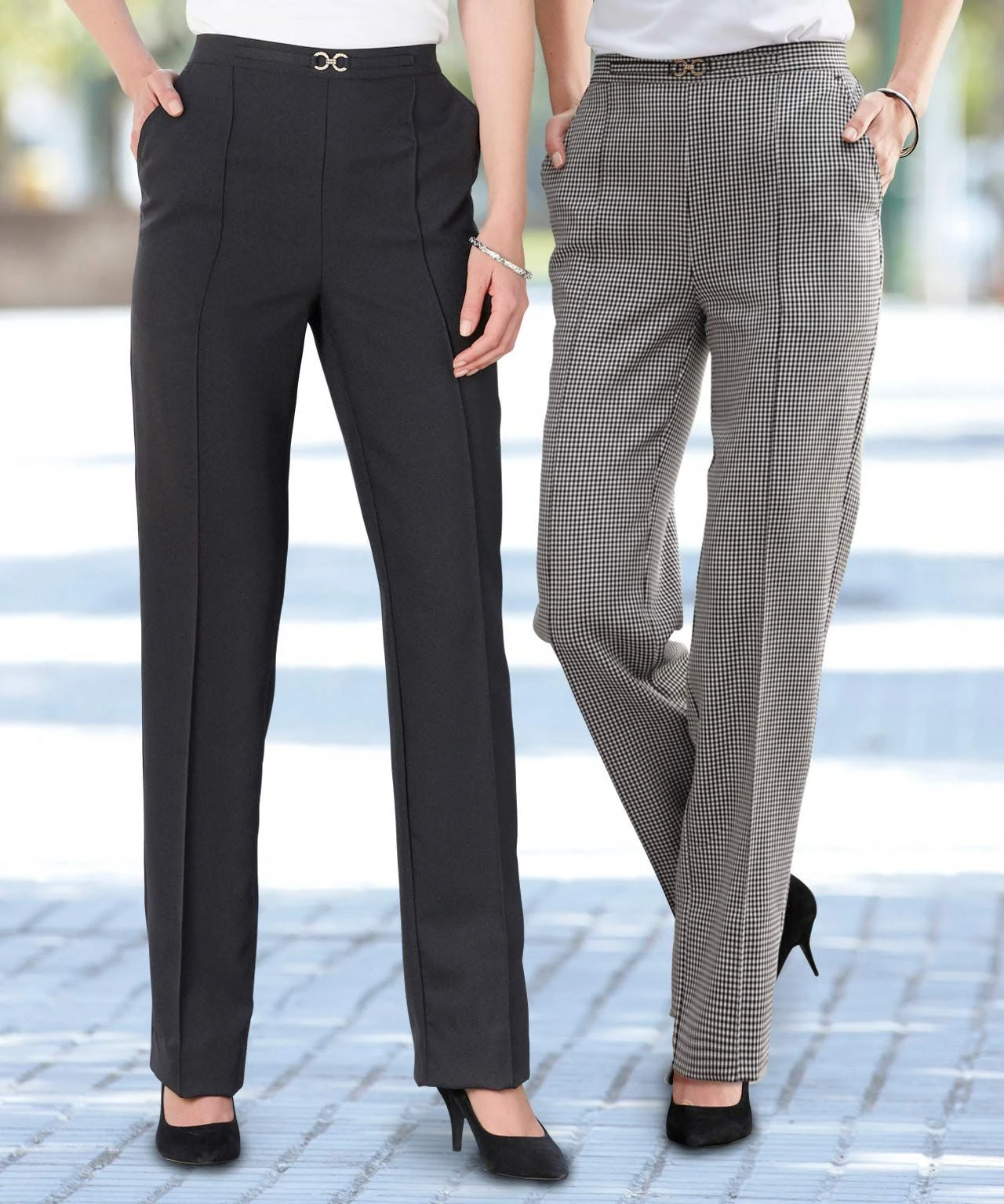 Stock up for spring with great value trousers for everyday style you’ll turn to, time and again. In a pack of two, they’re finished with a smart snaffle trim, slant front pockets and stitched front leg creases and elasticated at the back for comfort. Pack consists of 1x Plain and 1x Check Trousers. Comfort fit – straight leg. Machine washable. Plain (navy, black, heather, camel): 100% polyester . Dogtooth (navy, black, camel): 76% polyester 4% elastane, Check (heather): 97% polyester 3% elastane. Lengths: 64cm (25inch), 69cm (27inch), 74cm (29inch).