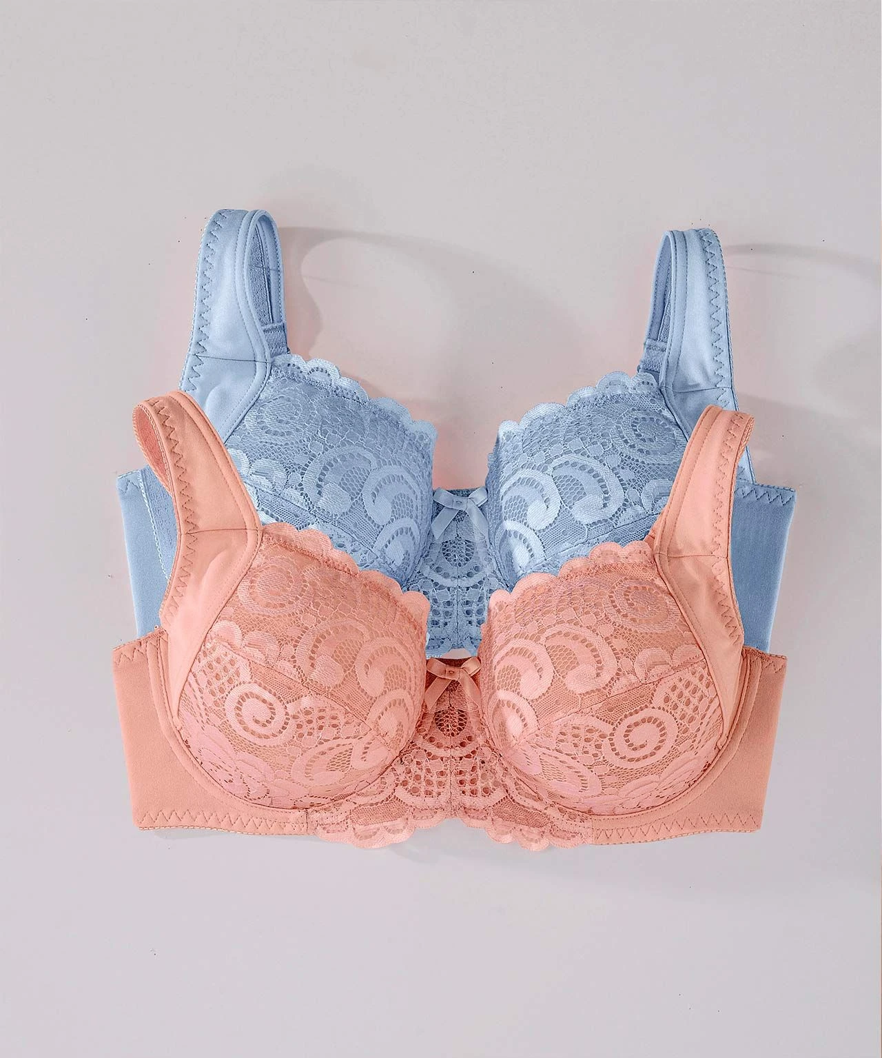 These are the perfect pieces to stock up your underwear drawer this spring. Our best-selling pack of two bras are available in a wide range of colours and designed for femininity and comfort, with side support bands and wider straps. Underwired half lined lacy cups, with double hook back fastening in 3 positions to get your fit just right. Machine washable.