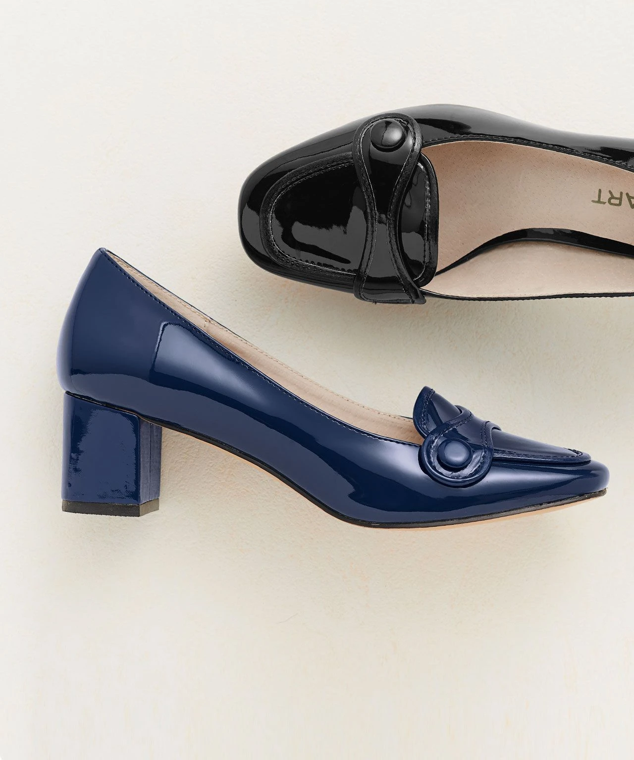 Endlessly smart patent court shoes with button trim in a range of colours.