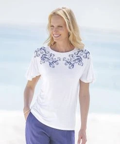 In soft stretch jersey and a stylish print, this t-shirt is great for all day comfort, at home and on holiday. With stretch for added comfort and cut with a roomy fit, it’s a piece that blends flattering style with all day ease. Comfort fit.