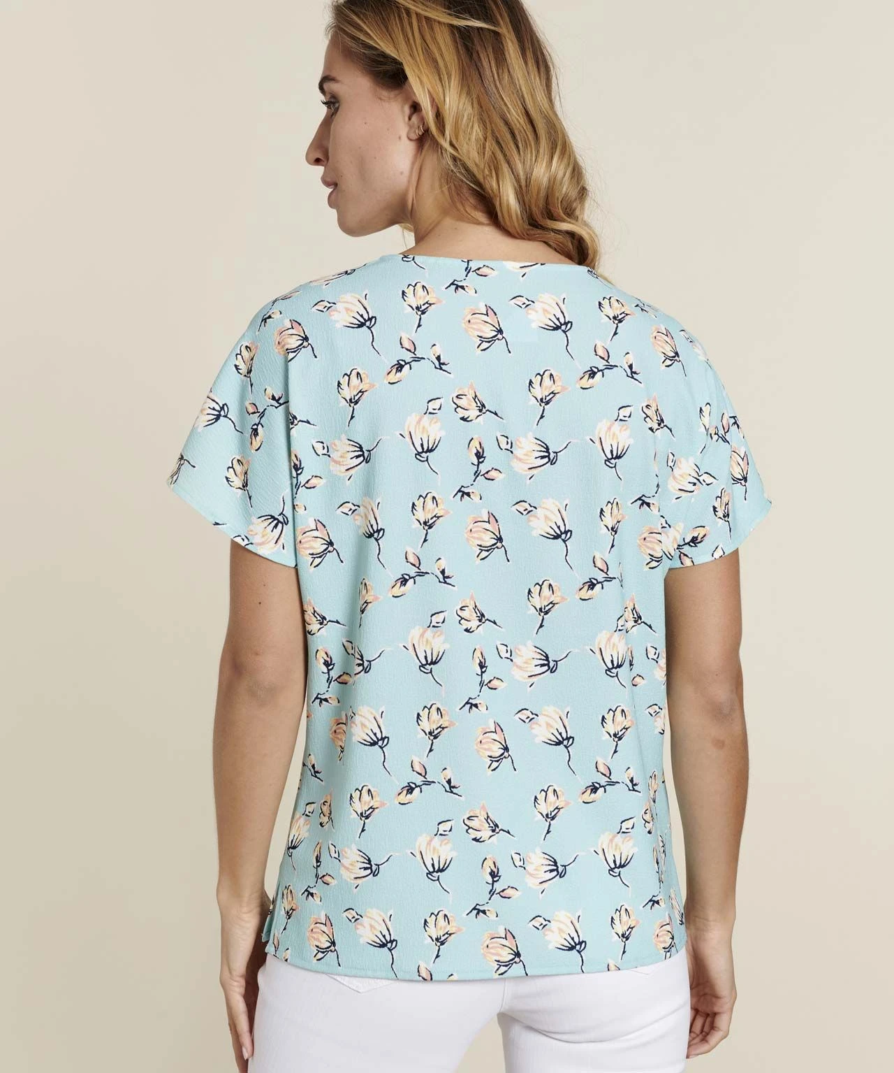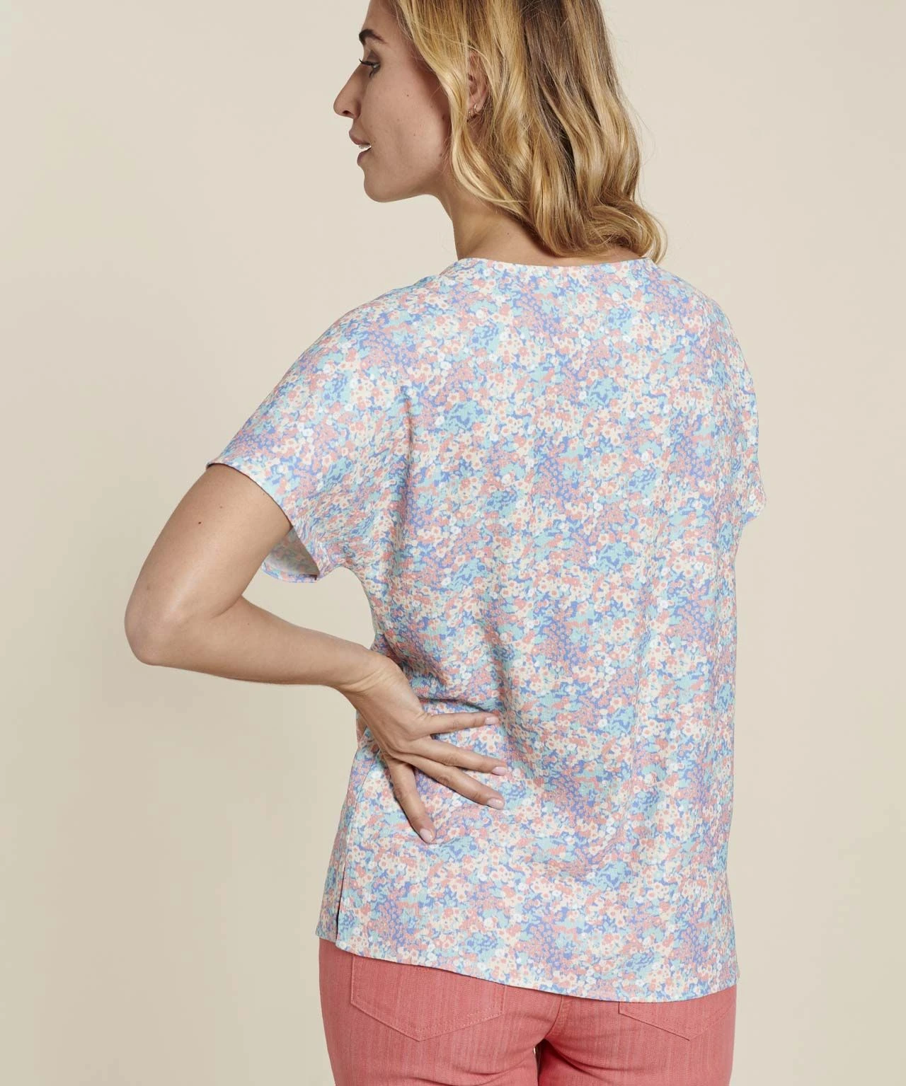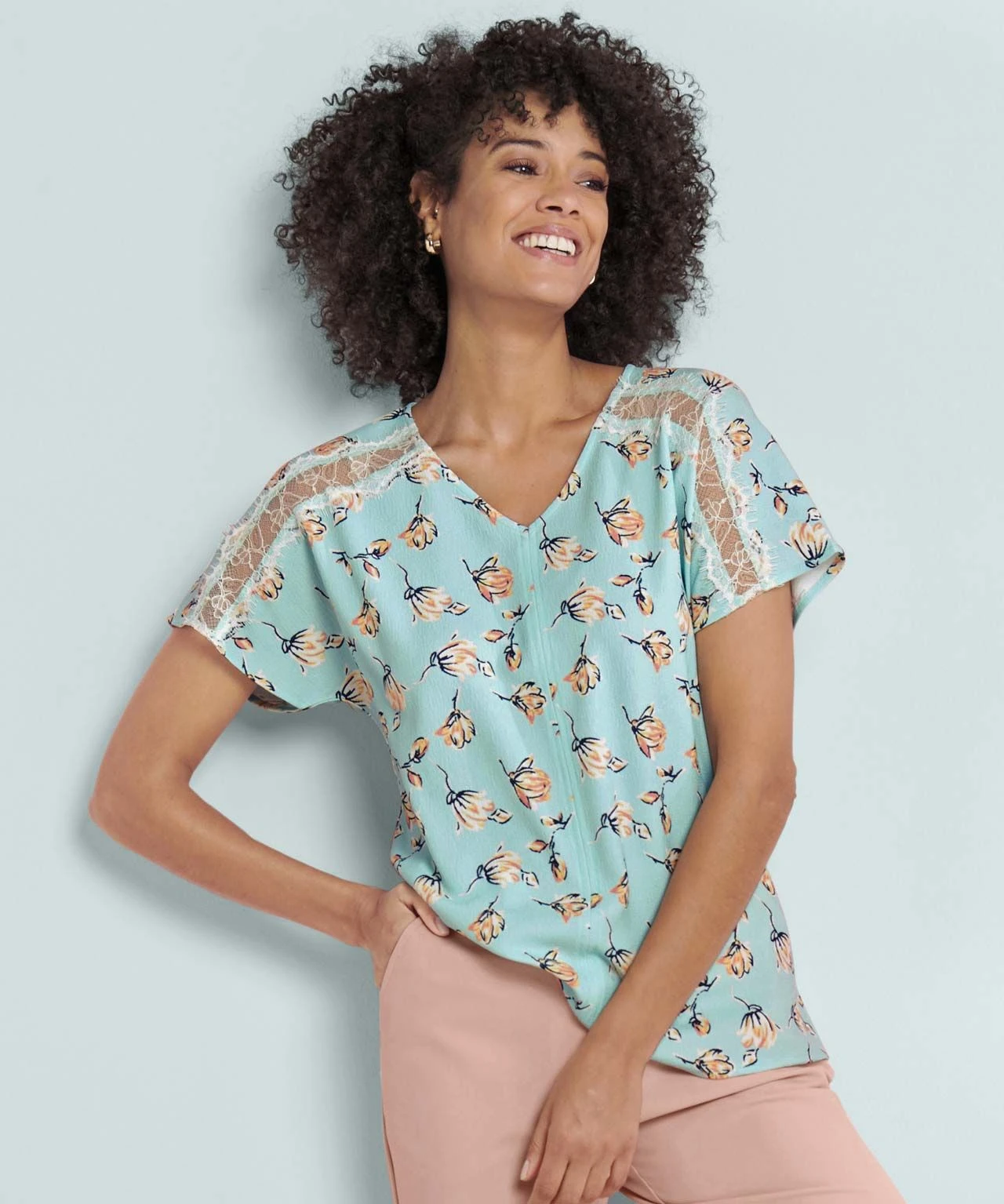 Our lace detail print blouse has a simple V neck shape with side splits and lace inset detail.