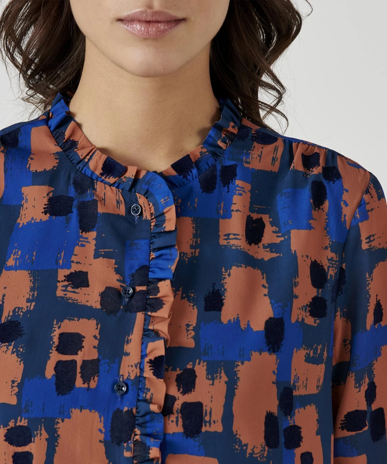 Frill trims at the neck and down the front give our abstract print blouse a fashionable twist.