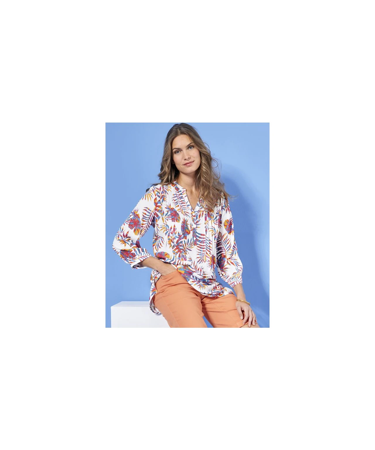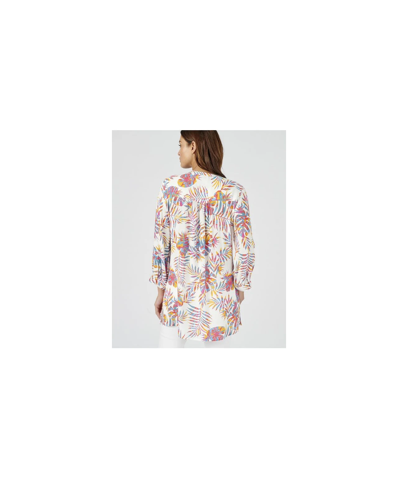 Give your look a tropical twist with our vibrant print tunic. With Tunisian notch neckline and part button fastening, 3/4 sleeves and pin tucks add all the detail you love. Relaxed and easy to wear, great with shorts or cropped trousers in the sun. Woven. Regular fit. 100% Viscose. Length: 74cm (29″) approx.