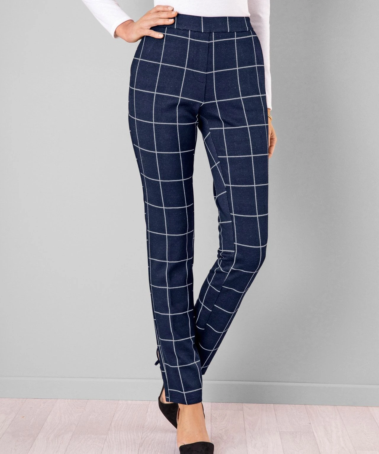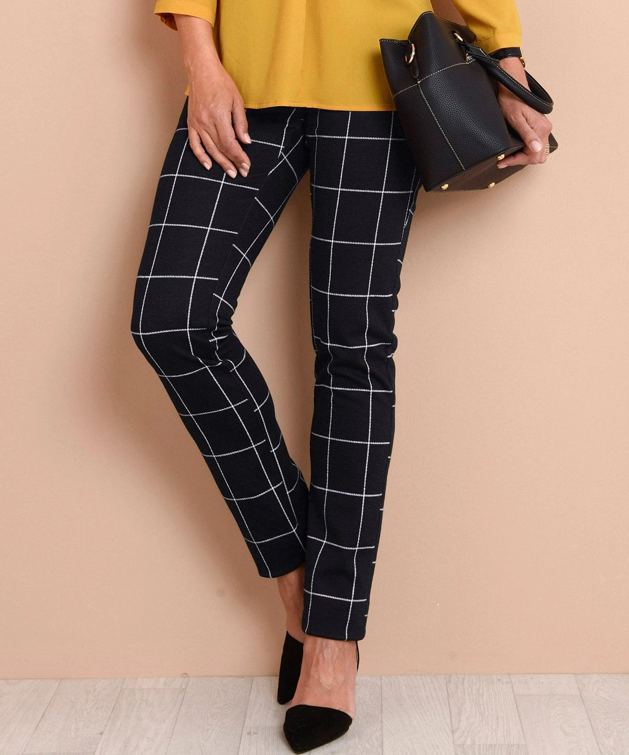These pull on trousers are wardrobe essentials designed for comfort with an elasticated waist and stretch in the fabric for ease. In a choice of leg lengths so you can get the fit just right and a choice of check or plain colourways, so you’re sure to find a look you love. Regular fit. Machine washable. Black Check: 75% Polyester, 23% Viscose, 2% Elastane. Grey Check: 72% Polyester, 26% Viscose, 2% Elastane. Other colours: 66% Viscose, 30% Polyester, 4% Elastane. Lengths: 64cm (25 inch), 69cm (27 inch).