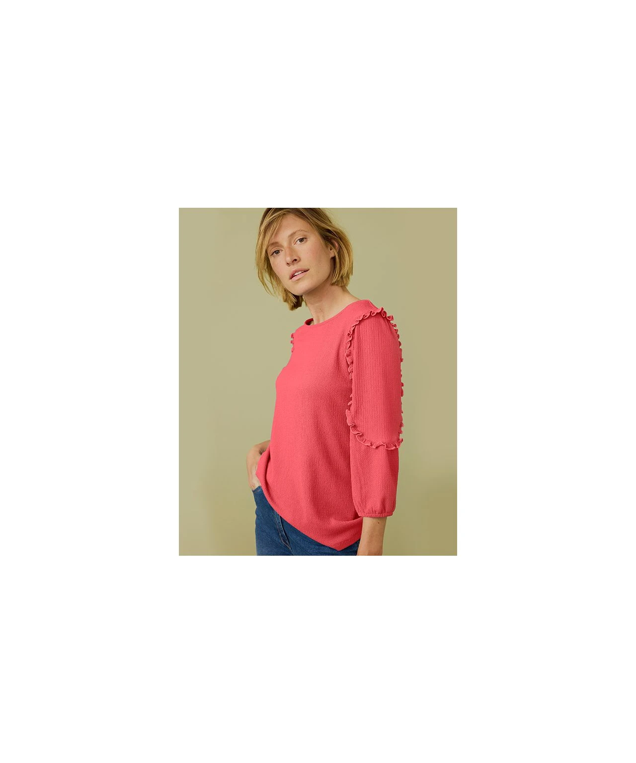 Such an easy to wear top with a difference. Frill detail and a boat neckline elevate it from your ordinary tops, with a hint of stretch for comfort and three quarter sleeves for wearable style. Made from eco-friendly recycled fibres. Knitted. Regular fit. Machine washable. 98% Polyester, 2% Elastane. Length: 61cm (24″) approx.
