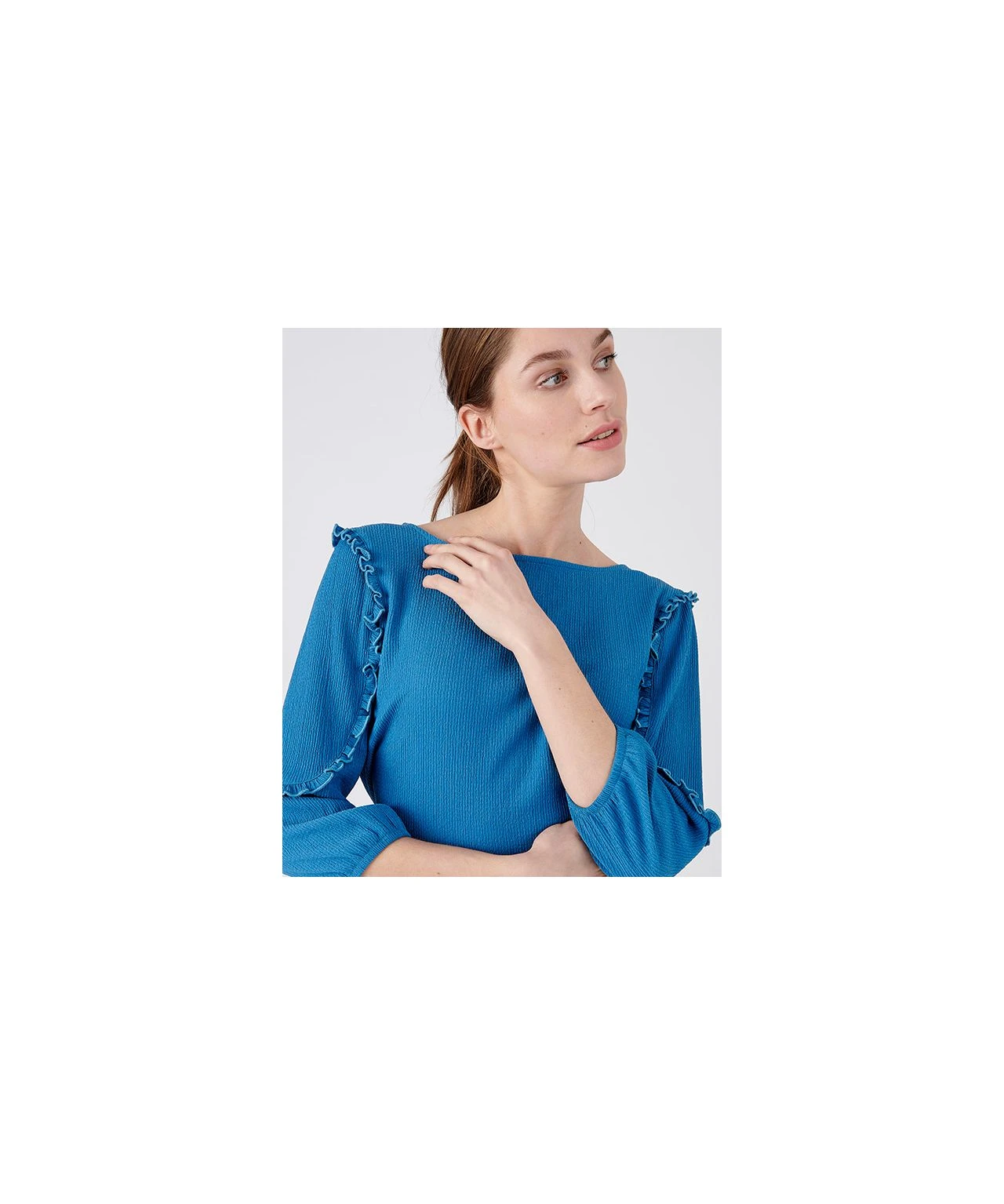 Frill detail and a boat neckline elevate this easy wear top.
