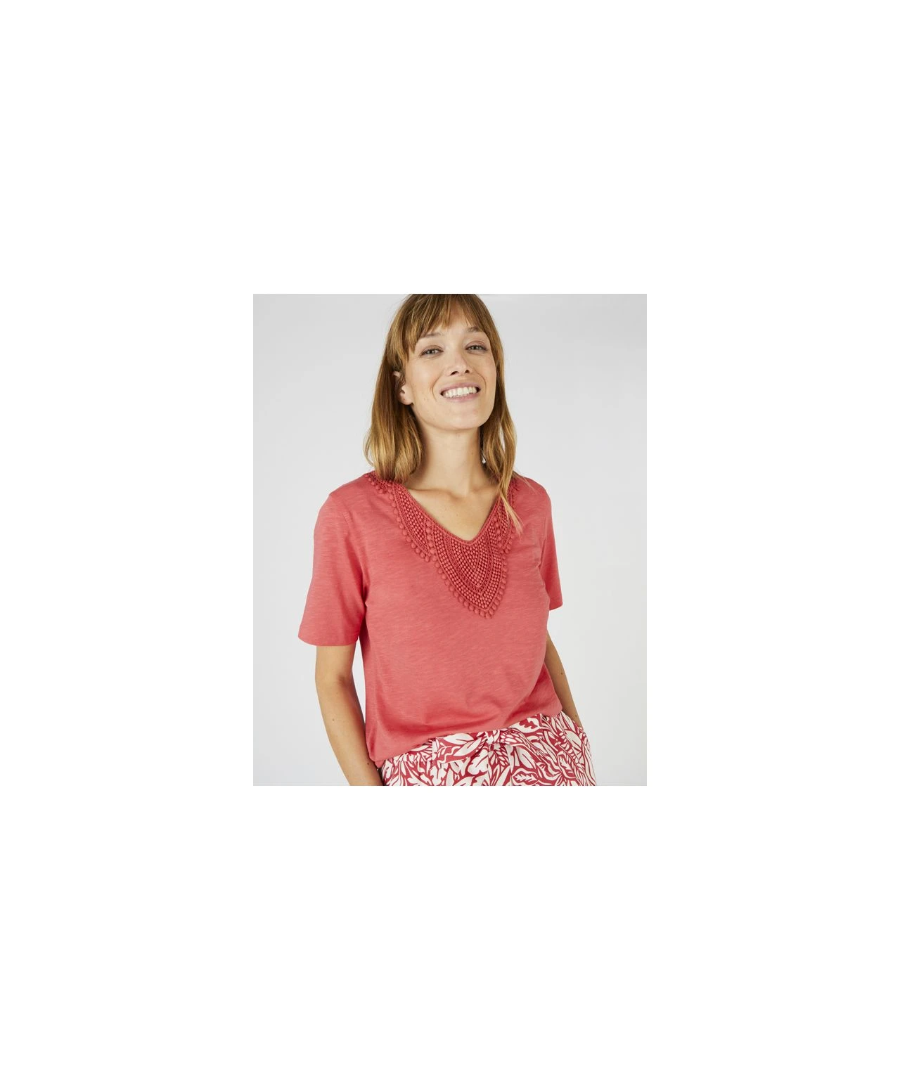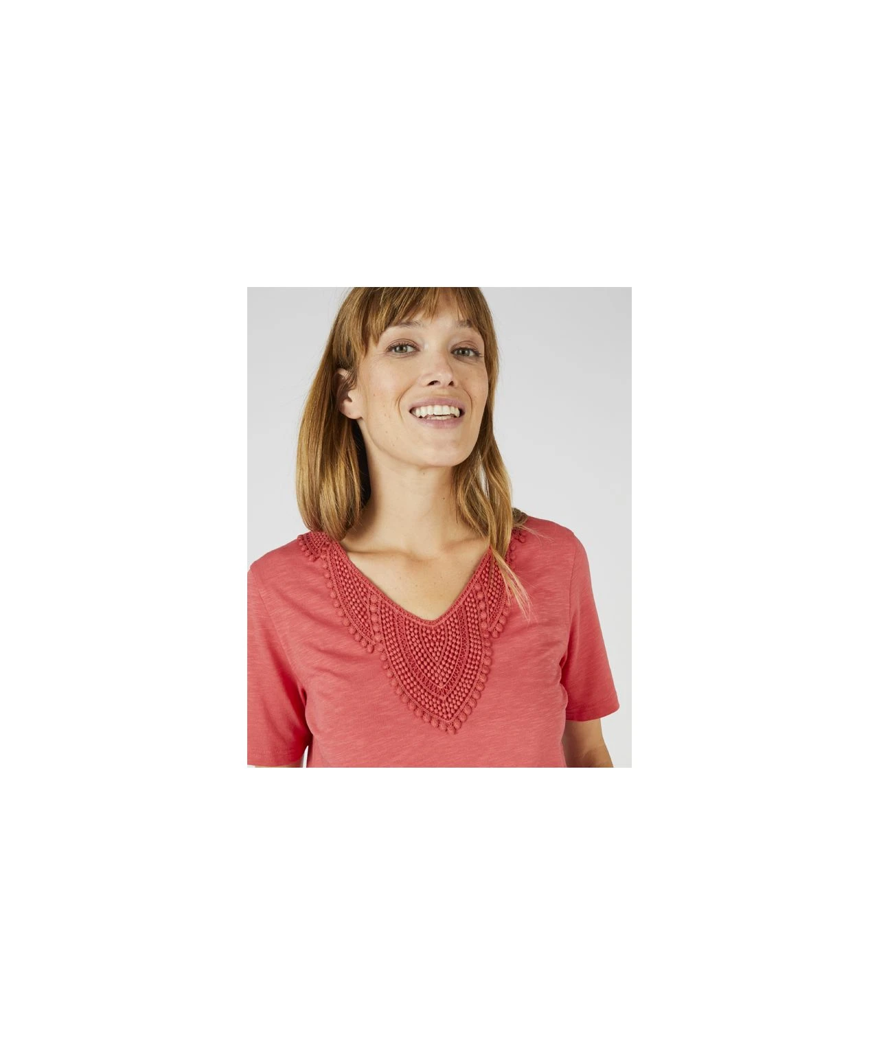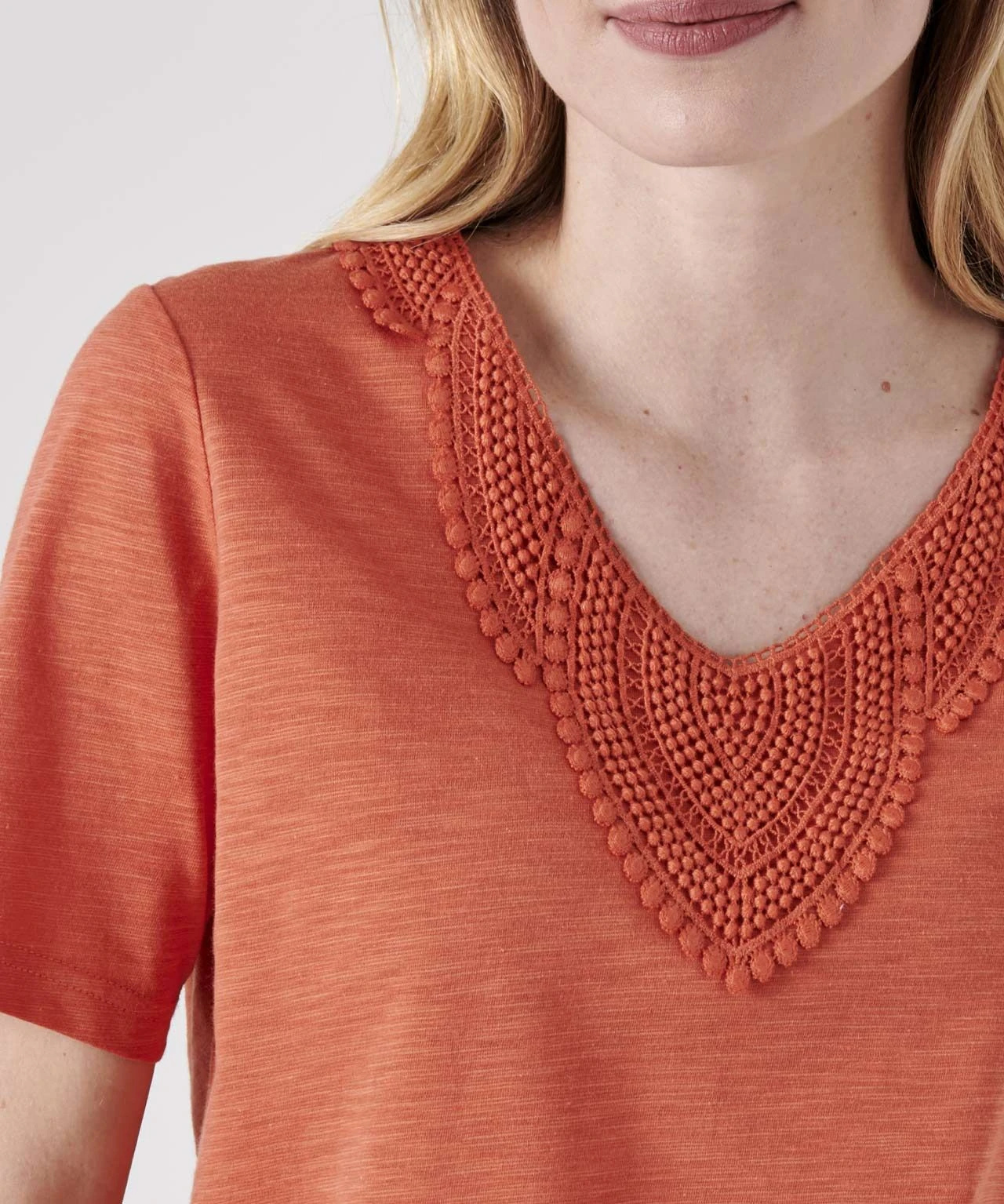 It’s all in the detail with our lace trimmed T-shirt featuring an intricate panel at the neckline for added style. A super soft organic cotton and modal blend that will keep you feeling fresh and very comfortable. In two great colours ¿ cedar and burnt orange. 75% Cotton, 25% Modal. Length: 61cm (24″) approx.