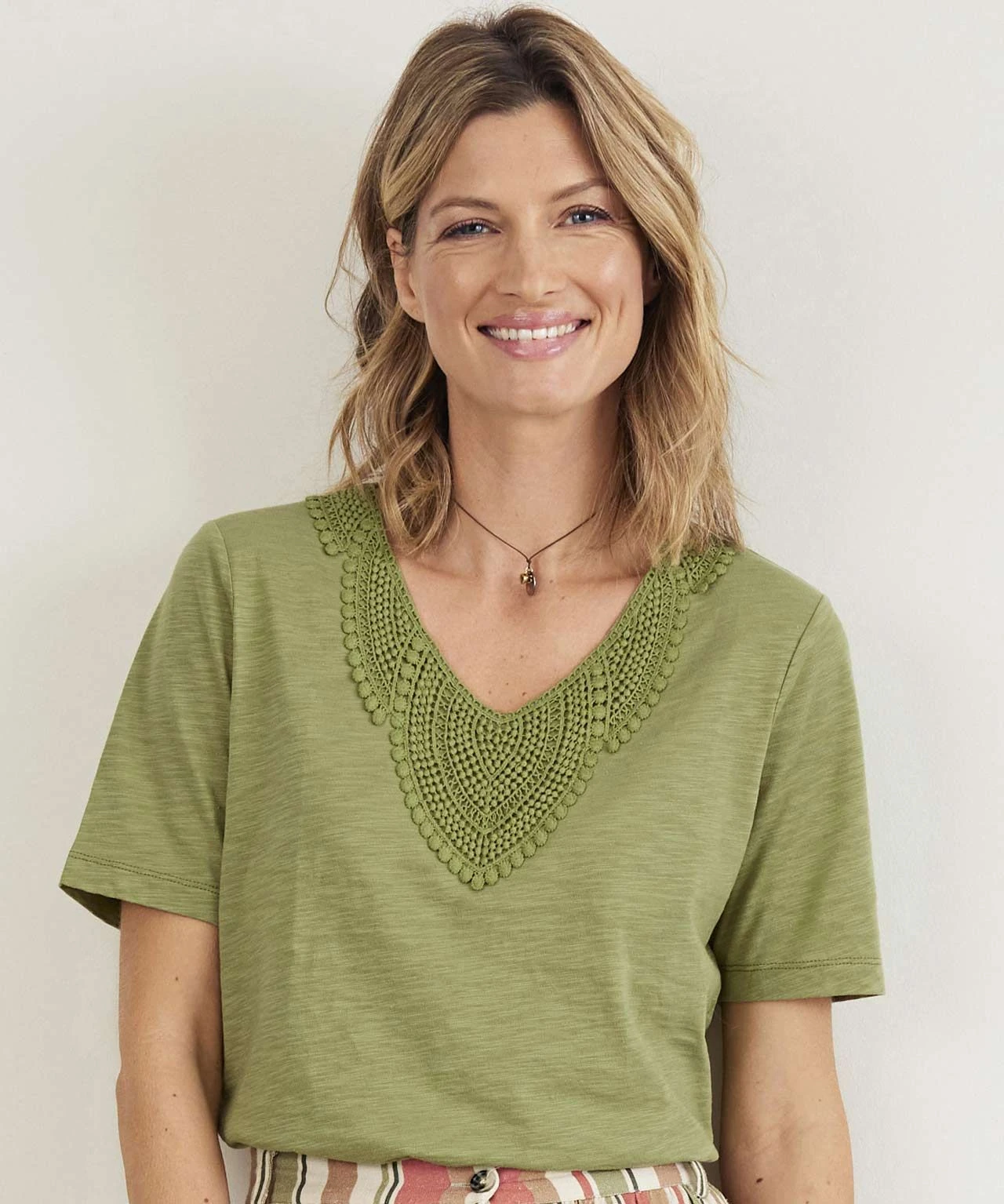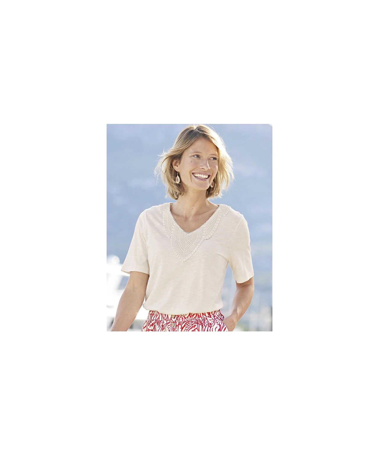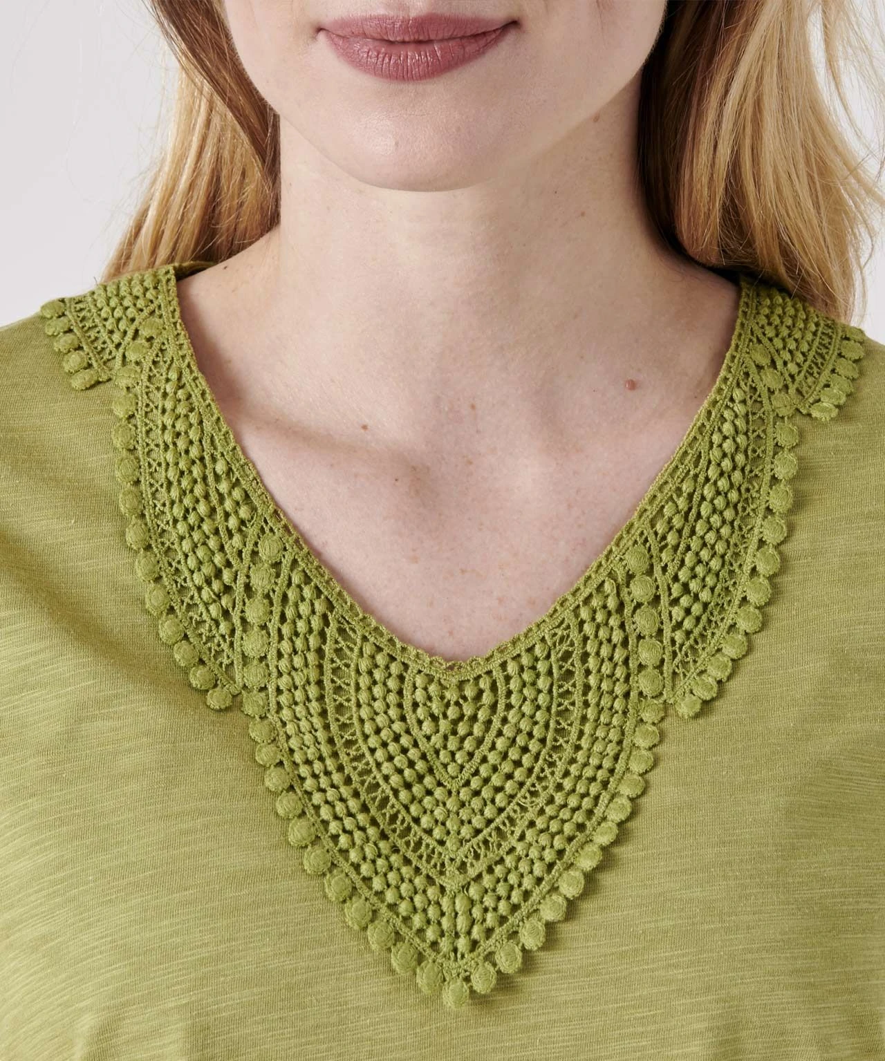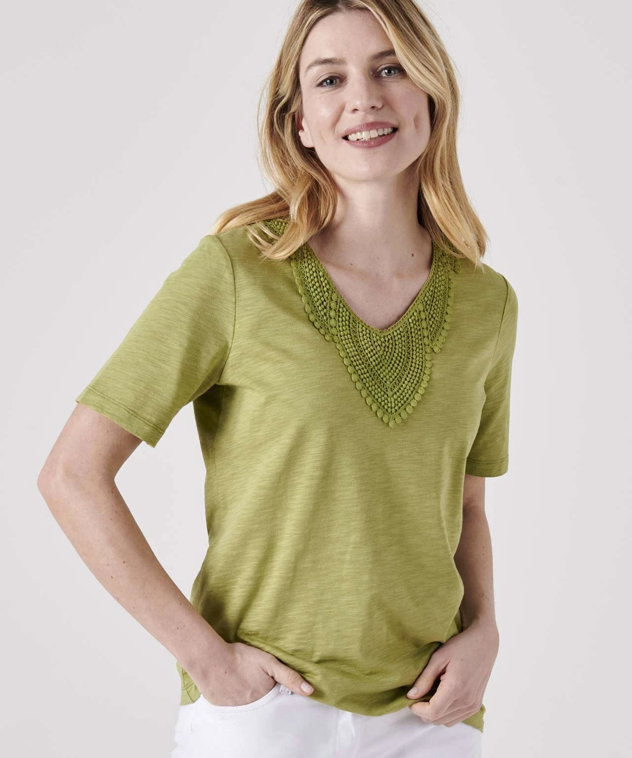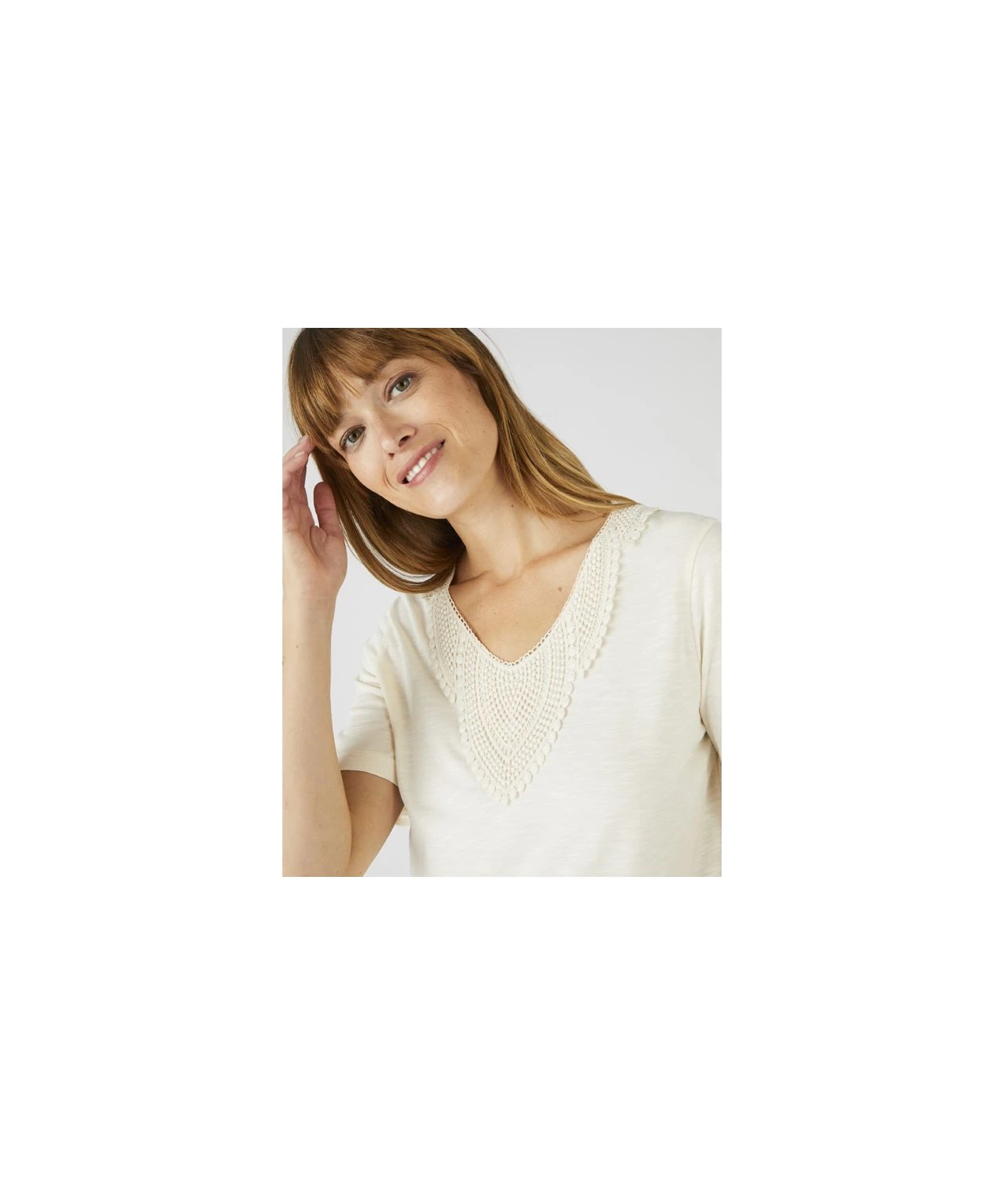Our lace trimmed T-shirt features an intricate panel at the neckline for added style.