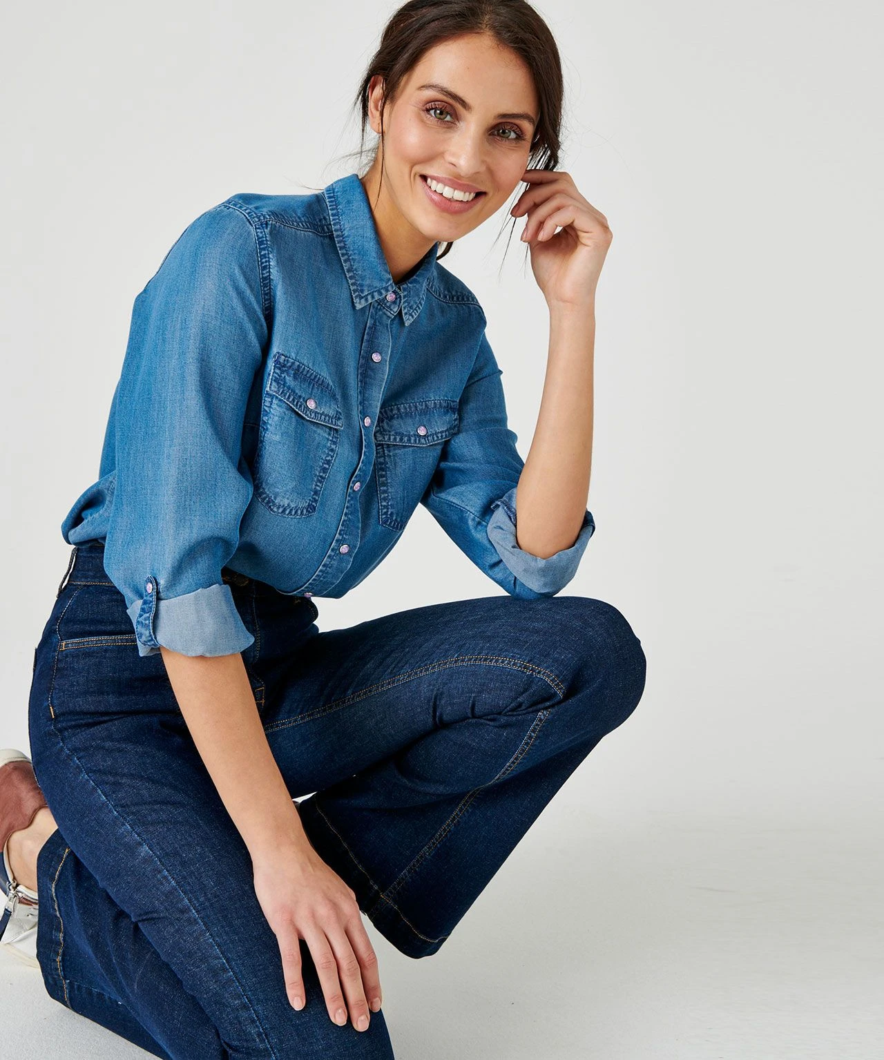 A wardrobe staple, this denim look shirt guarantees timeless style and comfort in one. Button-through with adjustable tab-back sleeves and front flap pockets with press-studs, in a smooth and soft fabric that feels great against your skin. Regular fit. 100% Lyocell. Length: 64cm (25″) approx.