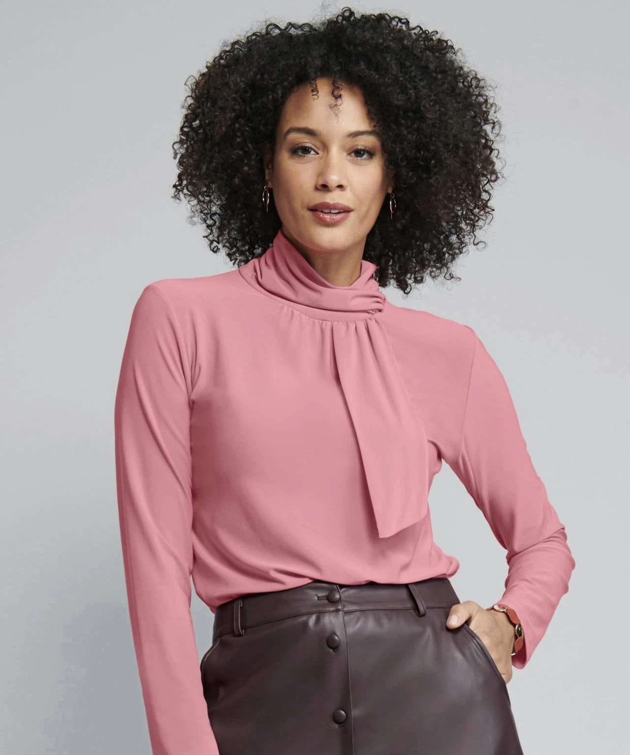 Mock wrap top for flattering style, with a high neck so it’s perfect for the cooler seasons.