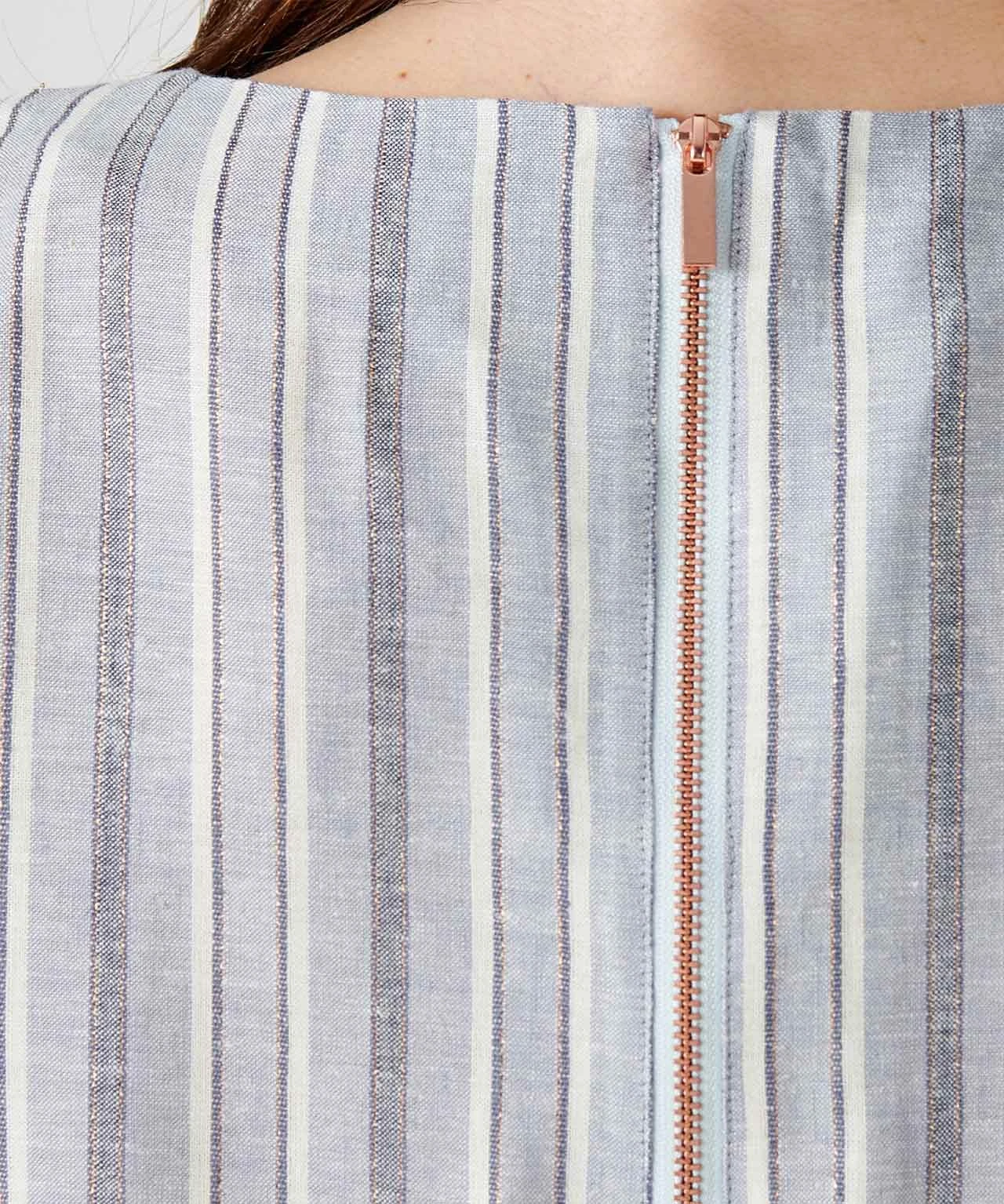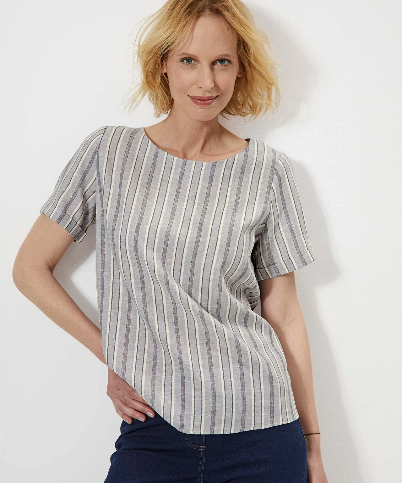 Cool and modern, our linen blend top has turn-up sleeves and back zip fastening. A contemporary shell top that you can wear for work or evenings out, with a hint of sparkle in the stripe for a stylish twist. Comfort fit. 50% Viscose, 48% Linen, 1% Polyester, 1% Metallic fibres. Length: 61cm (24″) approx.
