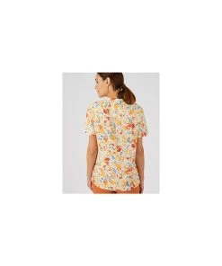 Gorgeous tropical palm print blouse for sunny day style. With gathered shoulder detail, 3/4 tab-back sleeves and bottom side slit, the curved hem makes it the perfect piece over shorts and chinos. In pure cool cotton for breathable comfort on the warmest of days. Comfort fit.