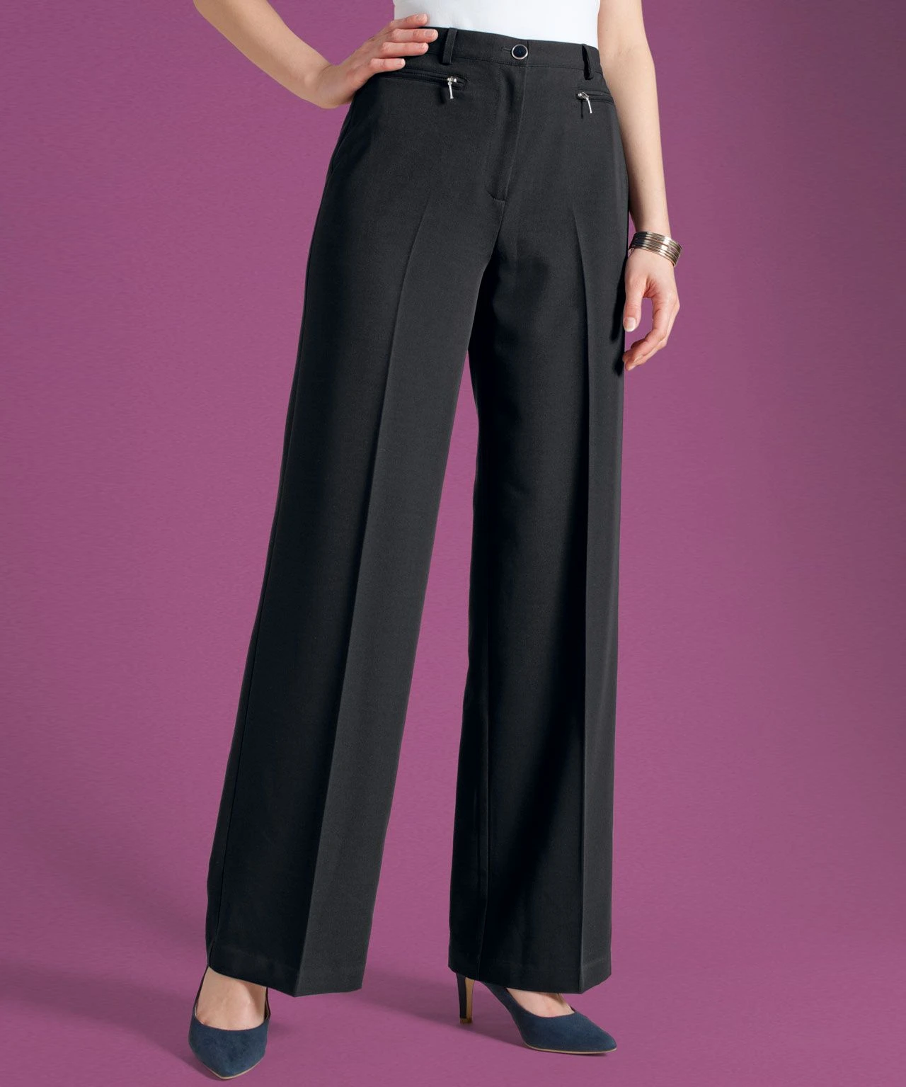 Elegant wide leg trousers with a hint of stretch at the waist for comfort and your perfect fit.
