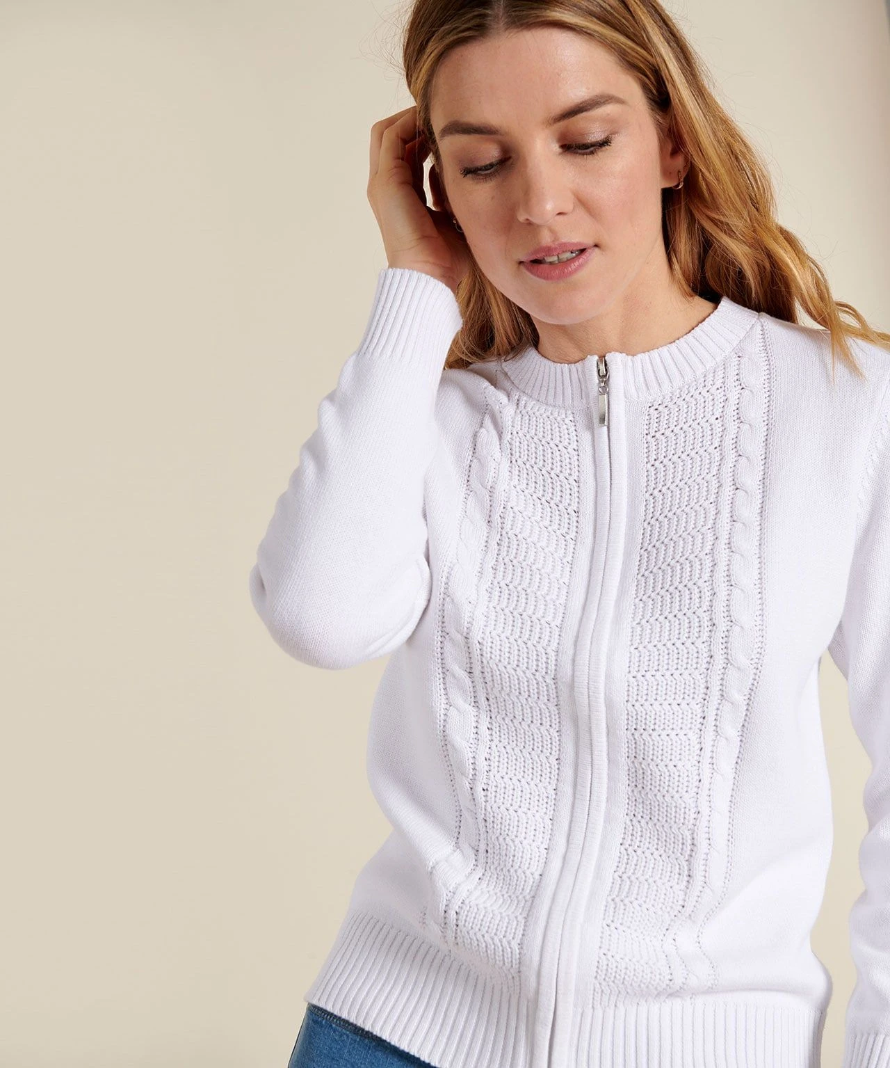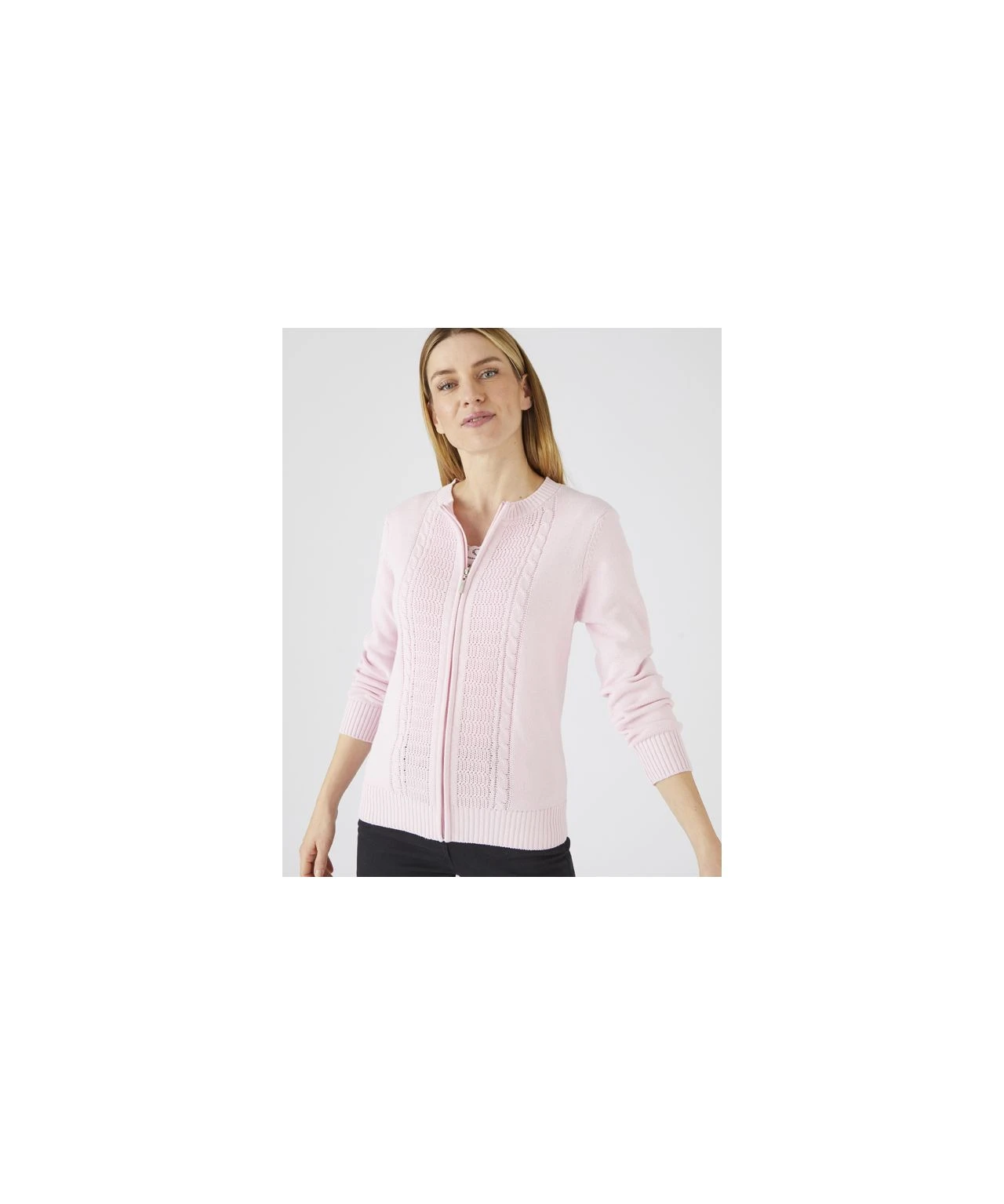 Slip this easy women’s cardigan over your t-shirts or vests for a touch of added warmth when you need it most. A great layer for warmth on cool days, with cable stitch detail and neat rib trims. In pure cotton for a feel of quality and comfort. Regular fit.